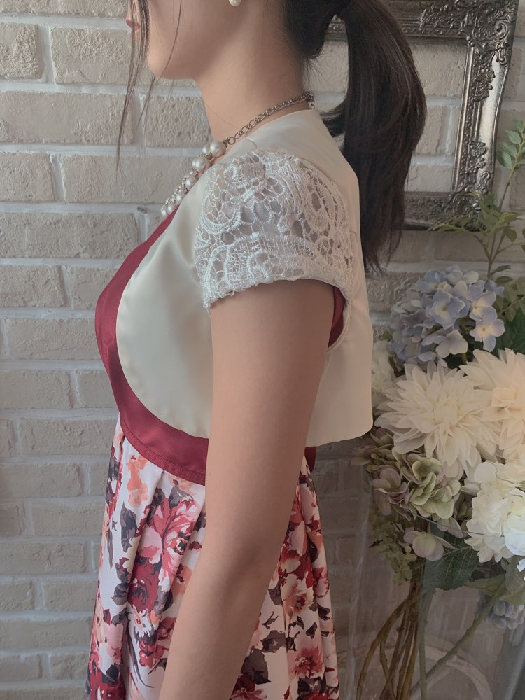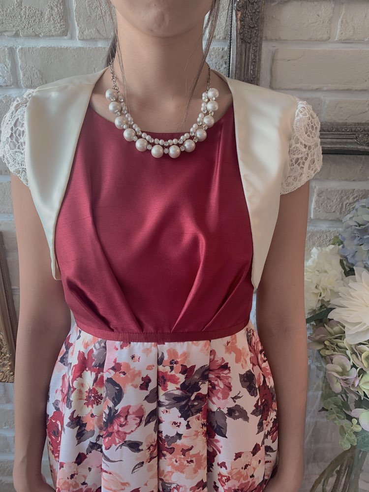 レースの袖のデザインがポイントのショート丈ボレロ。光沢あるサテン生地は、ジャケットのようなかっちり感もあり、袖のレースと相まって、とても上品な印象に仕上がります。オフホワイトのカラーは、パステルカラーのドレスをよりフェミニンに見せてくれ、ネイビーやブラックのダークカラーや大人っぽいデザインのドレスとも相性がいいです。形はシンプルで、コンパクトですっきりしたシルエットなので、ボリュームあるドレスやロングドレスとに合わせてもバランス良く着ていただけます。ショート丈なので、小柄な方や小・中学生にもオススメです。結婚式のお呼ばれはもちろん、謝恩会や発表会、成人式など様々なパーティーシーンに活躍してくれます。