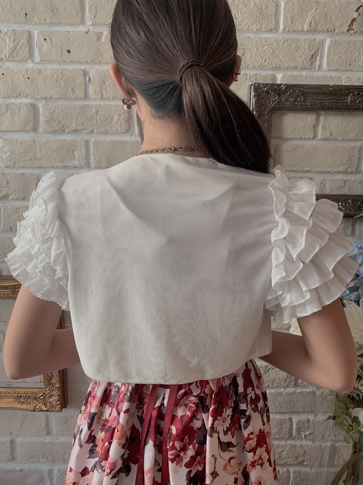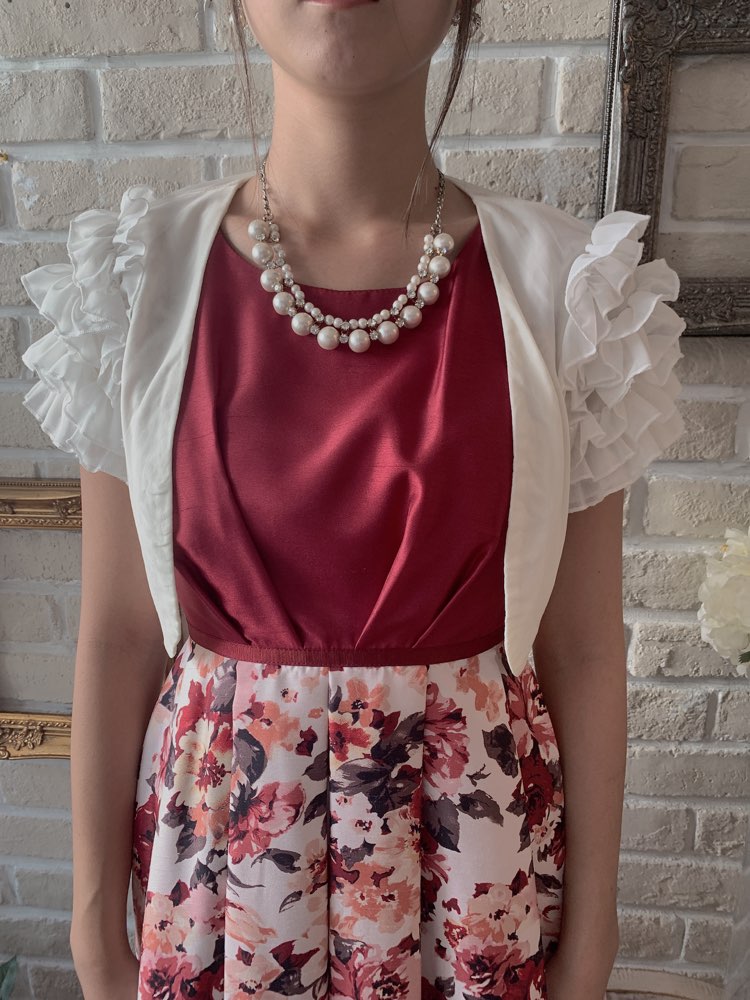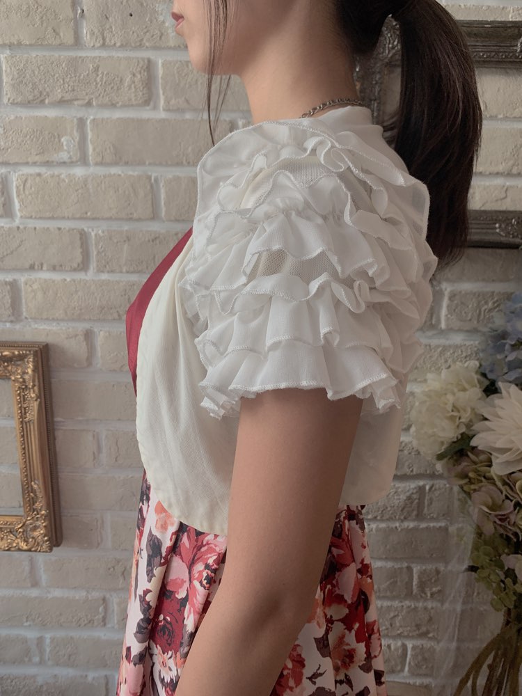 立体感のある袖のティアードフリルのデザインが華やかな印象のホワイトのボレロです。袖以外はシンプルで、ボリュームも抑えめなので、シルエットもとても綺麗です。ホワイトのカラーは、パステルカラーのドレスをよりキュートな印象に仕上げてくれます。また、ウェディングドレスに合わせて露出を抑えたり、二の腕カバーにも役立ちます。ウエストラインにもかからない着丈ですので、細見え効果も高く、ドレスのシルエットも活かせる1枚となっております。結婚式のお呼ばれはもちろん、謝恩会や成人式などのパーティー、発表会など幅広いシーンでご利用頂けます。