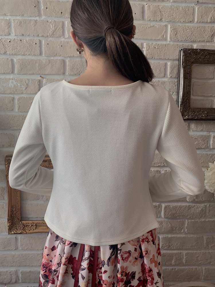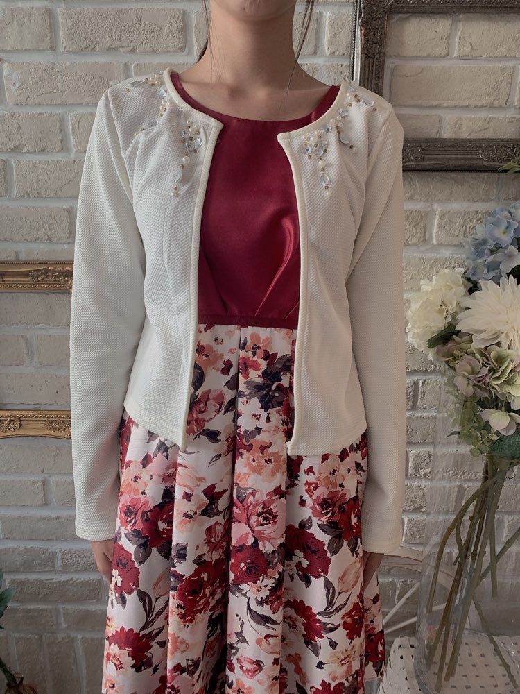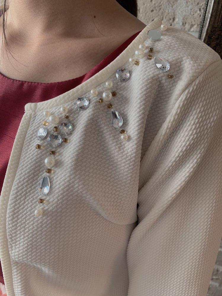 ビジューが華やかなオフホワイトの長袖ノーカラージャケット。春夏にもおすすめの裏地がないやや薄手の生地で、通気性もよく見た目も着心地もさらりと爽やかです。腰まである丈は長すぎないスレンダーなシルエットのドレスにぴったり。カジュアルなパーティーやディナーなど華やかなドレスをカジュアルダウンさせたい場合におすすめです。また、ビジネスシーンなどでスーツは着なくても少しだけカチッと感をプラスしたい場合にワンピースや手持ちのお洋服と組み合わせても。オフホワイトカラーにフロントはボタンでなくホックを使用することで、余計なものを削ぎ落としたスタイリッシュなイメージのデザインとなっております。