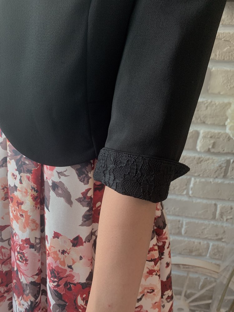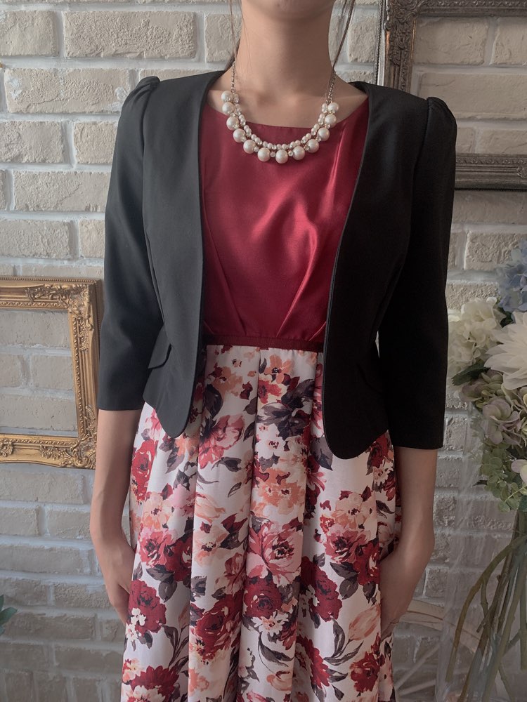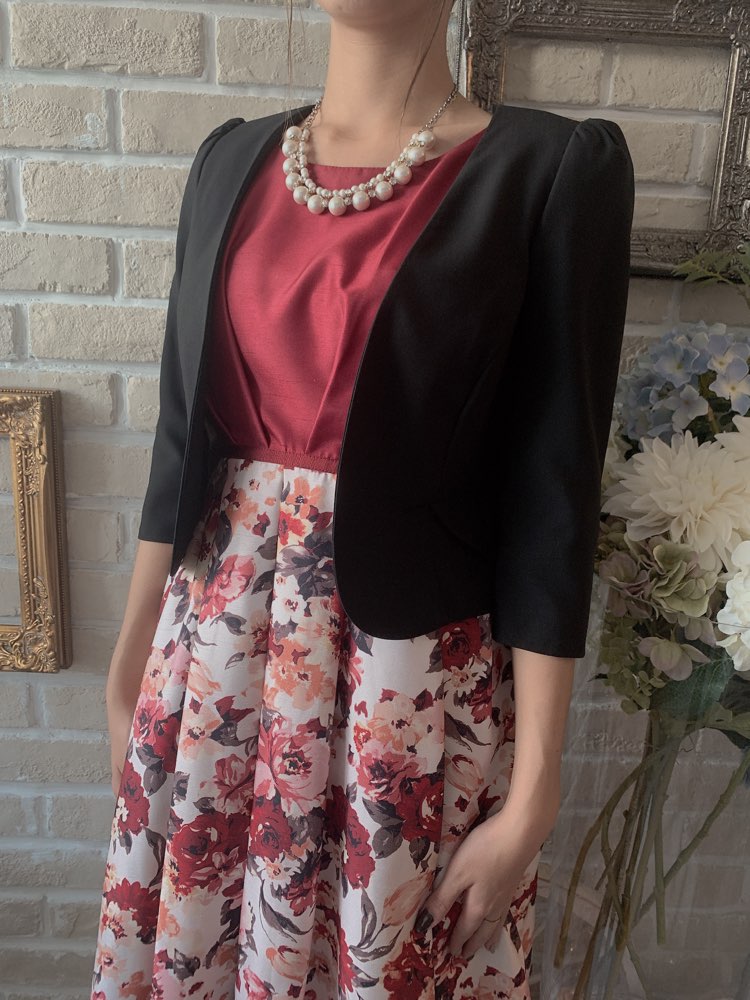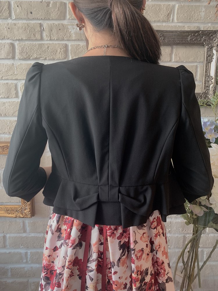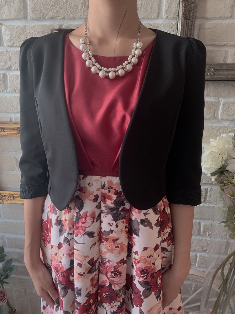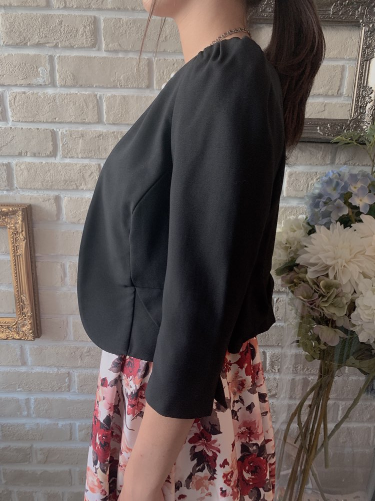 フォーマルなブラックのノーカラージャケット。ウエスト辺りまでのショート丈ですので、重たくならず、ドレスのデザインも邪魔せずすっきりお召いただけます。袖を折り返して五分袖にしたりと、お好みで調節できます。また、裏地がレースになっており、折り返したときのポイントなります。ドレスの華やかさを抑えたい方、ふんわりしたボレロの可愛らしさが苦手な方、少しかっちりさせたい場面など、様々なシーンに活躍します。ご親族様や会社の懇親会などにもオススメです。ゴールドやベージュ、グレーやボルドーなどの赤系のアイテムとは、特に相性が良いです。