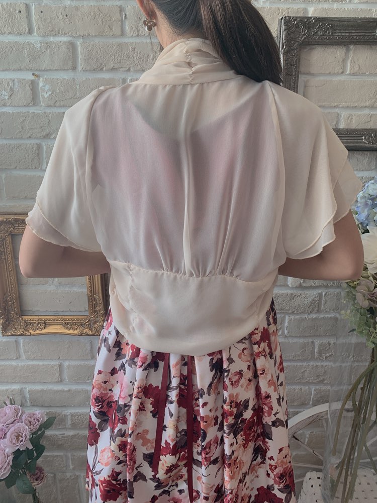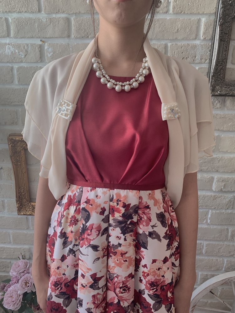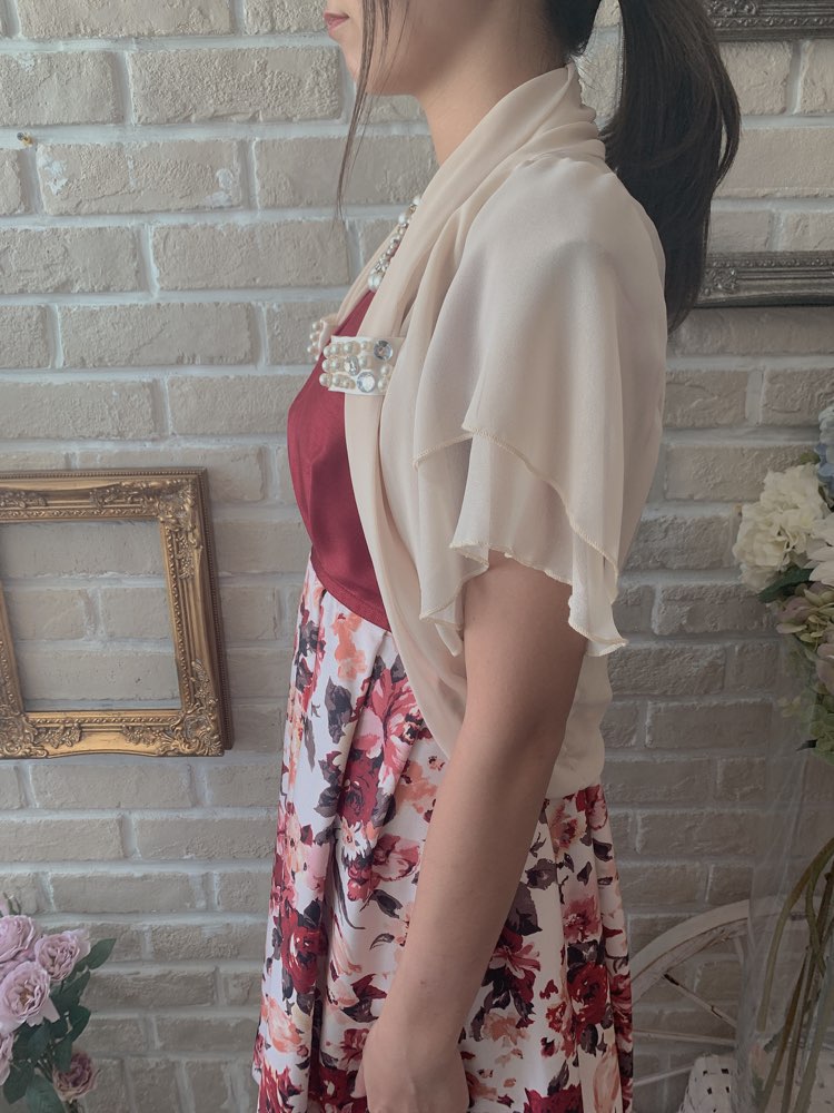 薄手のシンプルなデザインで、スッキリとした印象のボレロです。ラメの入ったピンクベージュのカラーは、肌なじみも良く、ネイビーやブラックのドレスはもちろん、ピンクやボルドーなどの暖色系やドレスとの相性抜群です。フレア袖がふんわりとエアリーな印象に仕上げ、女性らしい魅力を引き出してくれ、二の腕カバーにも一役買ってくれます。シンプルですが、胸元に大粒パールが入っており華やかな装いにもぴったりの一品。女性らしいデザインが沢山盛り込まれてはいますが、可愛くなりすぎず、着丈も長めですので、20代後半~30代の方やご親族様にもオススメです。季節も問わず、幅広いシーンでご利用頂けます。