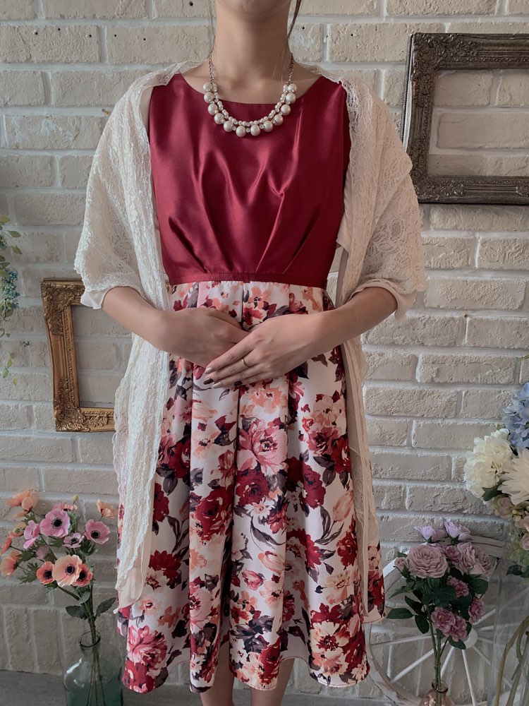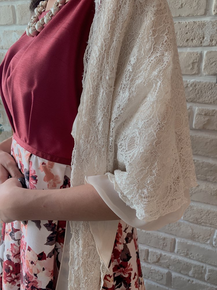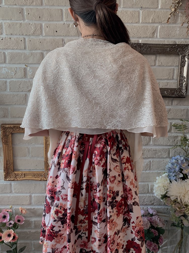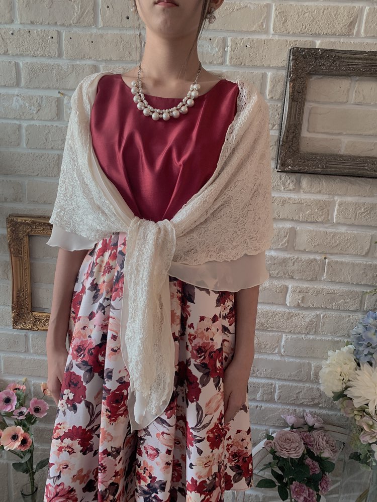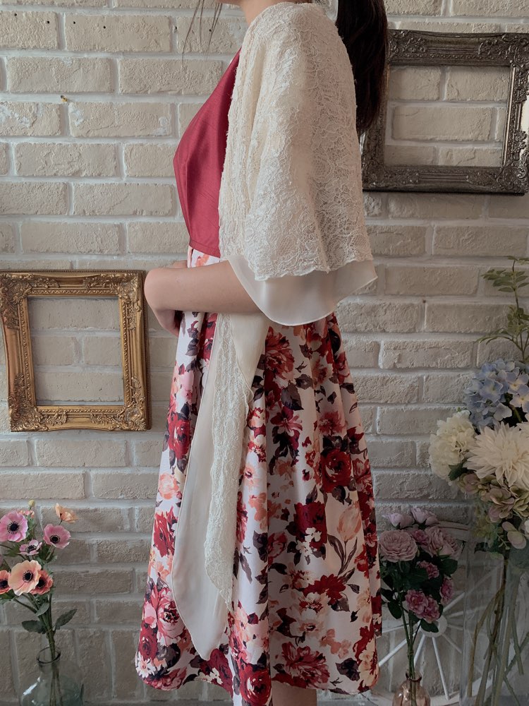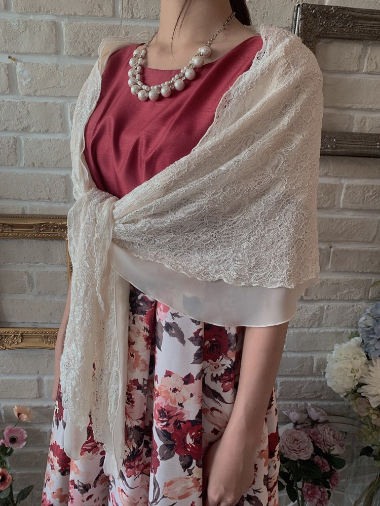 優しいベージュカラーのストール風のボレロです。一見ストールのように見えますが、袖を通せるようになっており、大人っぽいシルエットはそのままに、はだけやすいストールのデメリットを解消してくれる優秀なアイテムです。柔らかいシフォンと上品なレースのレイヤードになっていて、エレガントな雰囲気に仕上げてくれます。透け感もないので、ベアのドレスとも安心して合わせられ、気になる二の腕もカバーしてくれます。また、前で結べばお腹も隠せて、お食事も思いっきり楽しめます。結婚式のお呼ばれはもちろん、謝恩会や成人式などのパーティー、発表会など幅広いシーンでご利用頂けます。