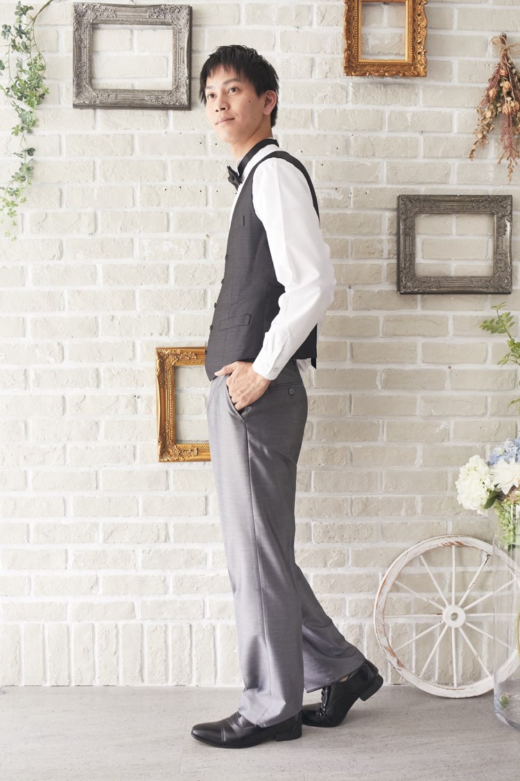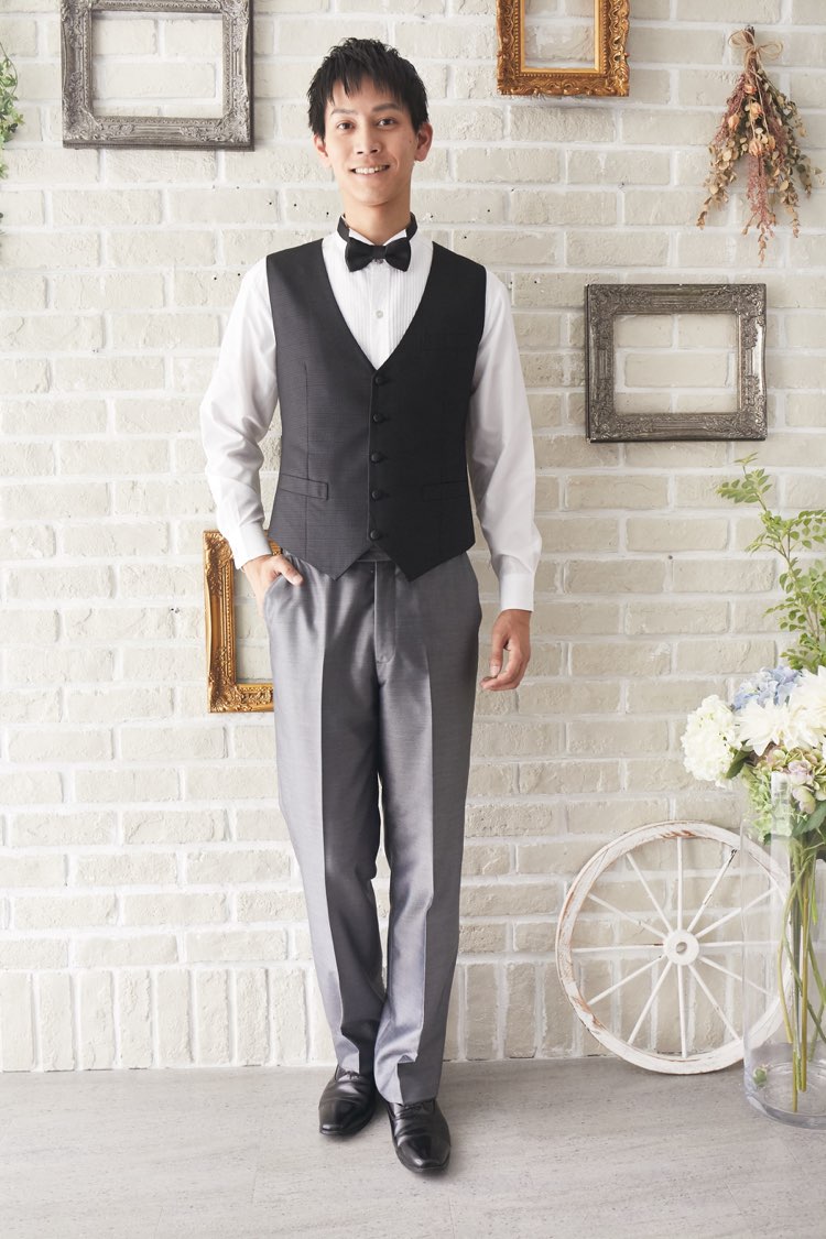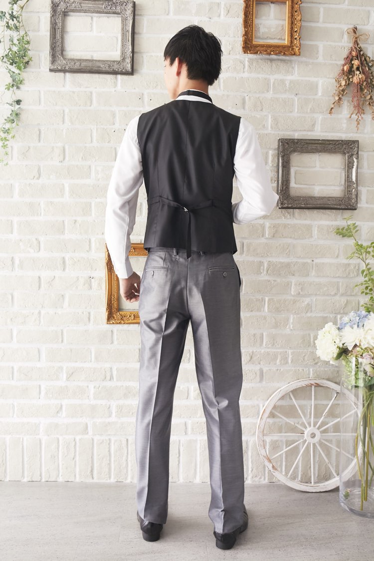 シンプルなブラック色で細かなラメが入ったベストです。ネイビー、ホワイト、ブラックなど無地のジャケットや、パンツはホワイトや、ブラック、ネイビーの無地パンツでも合わせやすい万能なベストです。また合わせるシャツをネイビー、細かいドット、ライトブルーなどカラー、柄シャツで合わせてカジュアルな二次会タキシードとしてもオシャレに仕上がります。また、白のウィングカラーシャツを合わせればきちんとした結婚式や披露宴向けのフォーマルなコーディネートになります。二次会ウェディング・海外やフォトウェディング、前撮りにまで幅広いシーンでご使用いただけます。結婚式お呼ばれや会社の懇親会などのパーティーにも。オールシーズンに適してます。