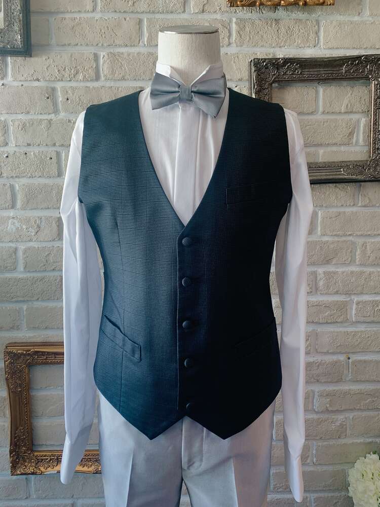 シンプルなブラック色で細かなラメが入ったベストです。ネイビー、ホワイト、ブラックなど無地のジャケットや、パンツはホワイトや、ブラック、ネイビーの無地パンツでも合わせやすい万能なベストです。また合わせるシャツをネイビー、細かいドット、ライトブルーなどカラー、柄シャツで合わせてカジュアルな二次会タキシードとしてもオシャレに仕上がります。また、白のウィングカラーシャツを合わせればきちんとした結婚式や披露宴向けのフォーマルなコーディネートになります。二次会ウェディング・海外やフォトウェディング、前撮りにまで幅広いシーンでご使用いただけます。結婚式お呼ばれや会社の懇親会などのパーティーにも。オールシーズンに適してます。