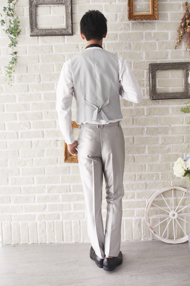 光沢のある明るいシルバーのベストです。ブラックのパイピングがすっきりした印象に仕上がります。シルバーのジャケット、パンツと3ピースのセットに白のウィングカラーシャツで合わせれば、きちんとした結婚式や披露宴向けのフォーマルなコーディネートになります。ネイビー、ライトブルーなどのカラーシャツやチェックなどの柄シャツで合わせれば、カジュアルな二次会タキシードとしてもオシャレに仕上がります。二次会ウェディング・海外やフォトウェディング、前撮りにまで幅広いシーンでご使用いただけます。結婚式お呼ばれや会社の懇親会などのパーティーにも。オールシーズンに適してます。