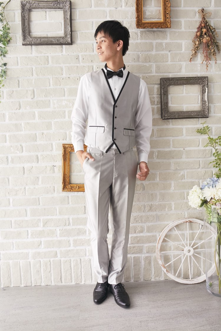 光沢のある明るいシルバーのベストです。ブラックのパイピングがすっきりした印象に仕上がります。シルバーのジャケット、パンツと3ピースのセットに白のウィングカラーシャツで合わせれば、きちんとした結婚式や披露宴向けのフォーマルなコーディネートになります。ネイビー、ライトブルーなどのカラーシャツやチェックなどの柄シャツで合わせれば、カジュアルな二次会タキシードとしてもオシャレに仕上がります。二次会ウェディング・海外やフォトウェディング、前撮りにまで幅広いシーンでご使用いただけます。結婚式お呼ばれや会社の懇親会などのパーティーにも。オールシーズンに適してます。