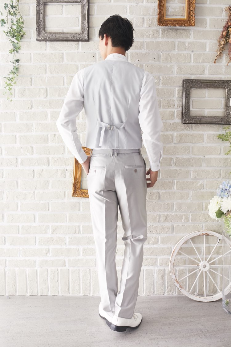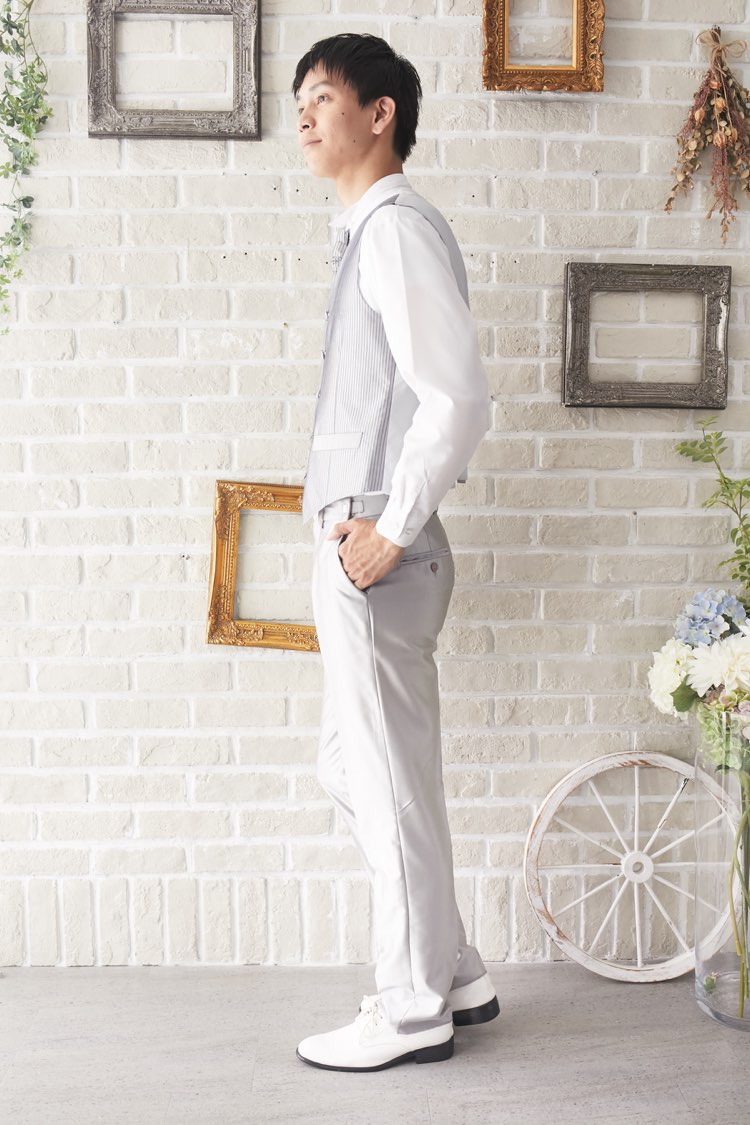 光沢のある明るめシルバーストライプ柄のベストです。シルバーのジャケット、パンツと3ピースのセットに白のウィングカラーシャツで合わせれば、きちんとした結婚式や披露宴向けのフォーマルなコーディネートになります。ネイビー、ライトブルー、ピンクなどのカラーシャツやギンガムチェックなどの柄シャツで合わせれば、カジュアルな二次会タキシードとしてもオシャレに仕上がります。二次会ウェディング・海外やフォトウェディング、前撮りにまで幅広いシーンでご使用いただけます。結婚式お呼ばれや会社の懇親会などのパーティーにも。オールシーズンに適してます。