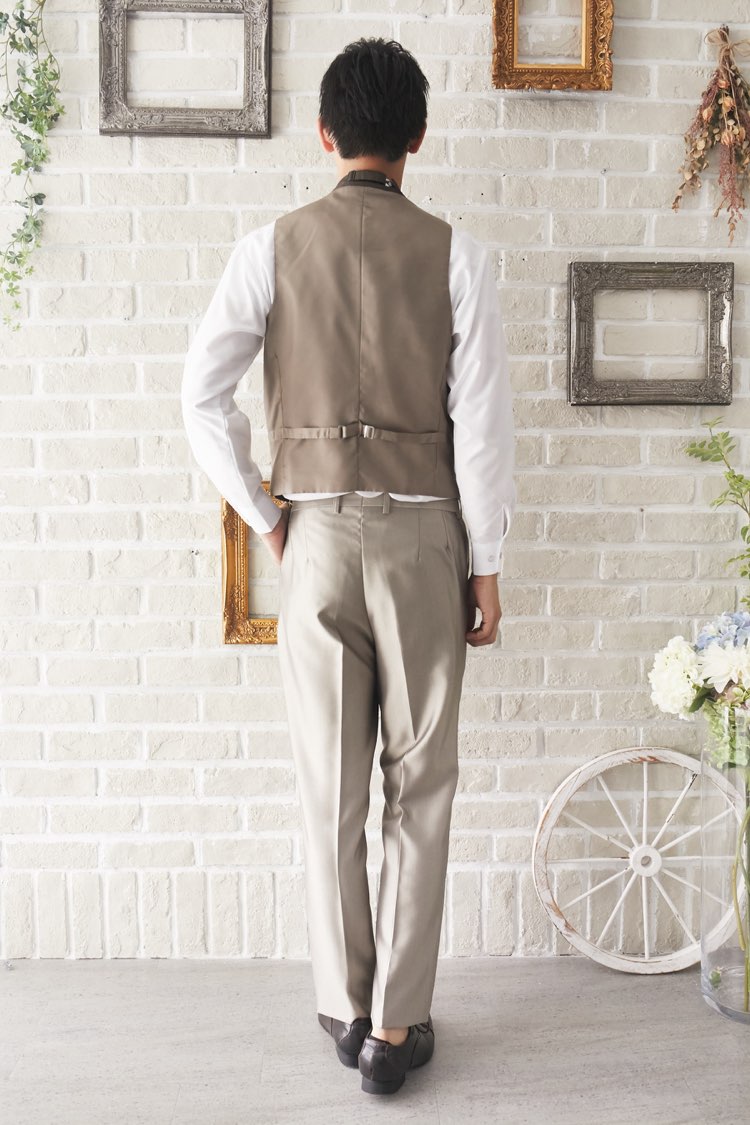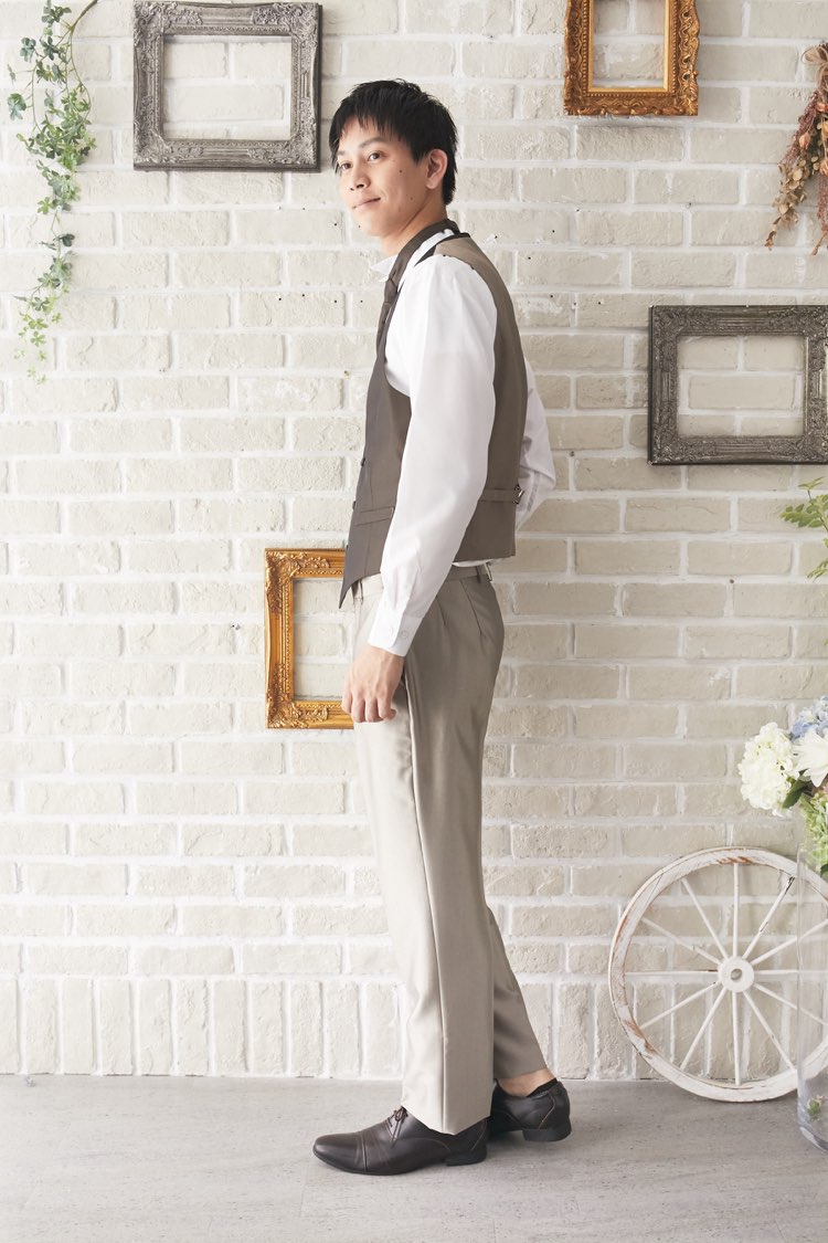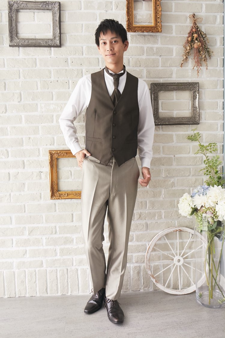 光沢感のある上品なブラウンのベストです。ホワイト、ブラックはもちろん、ボルドーやベージュ、ブラウンのジャケットやパンツと相性が良く、シンプルなので柄物などのアイテムとも合わせやすい万能なベストです。また合わせるシャツをアイボリー、ライトグレー、ボルドーなどのカラーシャツや柄シャツで合わせてカジュアルな二次会タキシードとしてもオシャレに仕上がります。また、白のウィングカラーシャツを合わせればきちんとした結婚式や披露宴向けのフォーマルなコーディネートになります。二次会ウェディング・海外やフォトウェディング、前撮りにまで幅広いシーンでご使用いただけます。結婚式お呼ばれや会社の懇親会などのパーティーにも。オールシーズンに適してます。