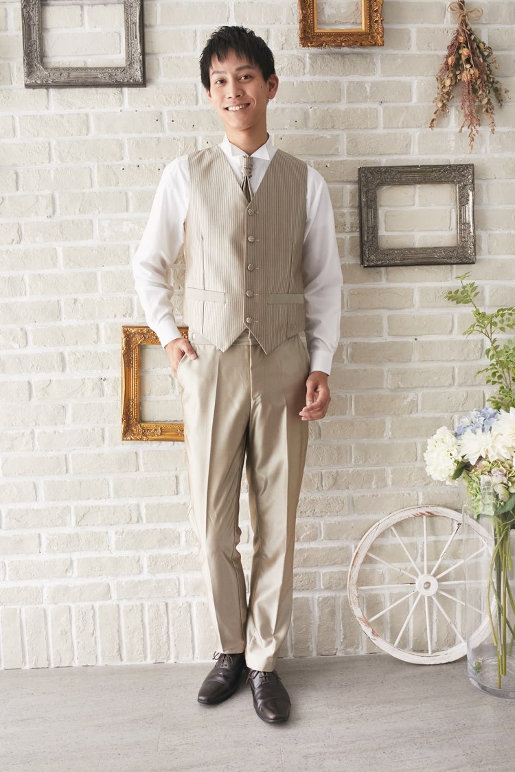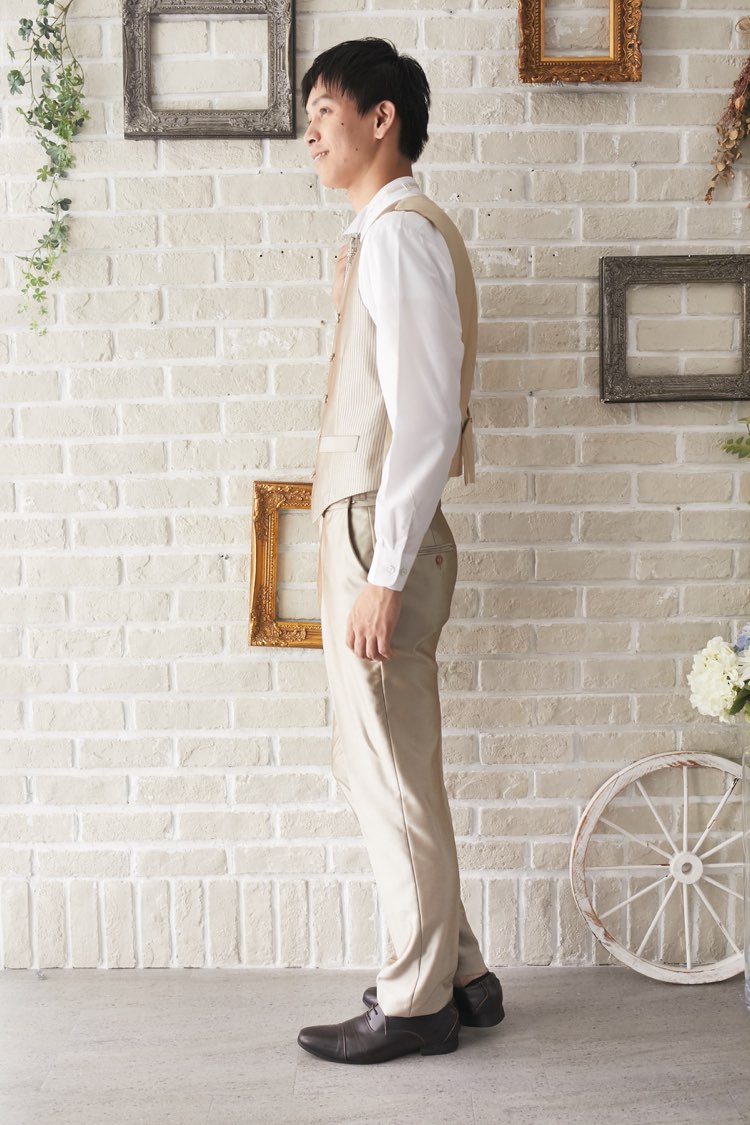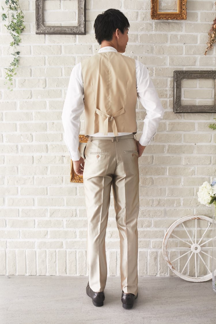 光沢のある明るいシャンパンゴールドのストライプ柄のベストです。シャンパンゴールドのジャケット、パンツと3ピースのセットに白のウィングカラーシャツで合わせれば、きちんとした結婚式や披露宴向けのフォーマルなコーディネートになります。ボルドーやライトグレーなどのカラーシャツで合わせれば、カジュアルな二次会タキシードとしてもオシャレに仕上がります。二次会ウェディング・海外やフォトウェディング、前撮りにまで幅広いシーンでご使用いただけます。結婚式お呼ばれや会社の懇親会などのパーティーにも。オールシーズンに適してます。