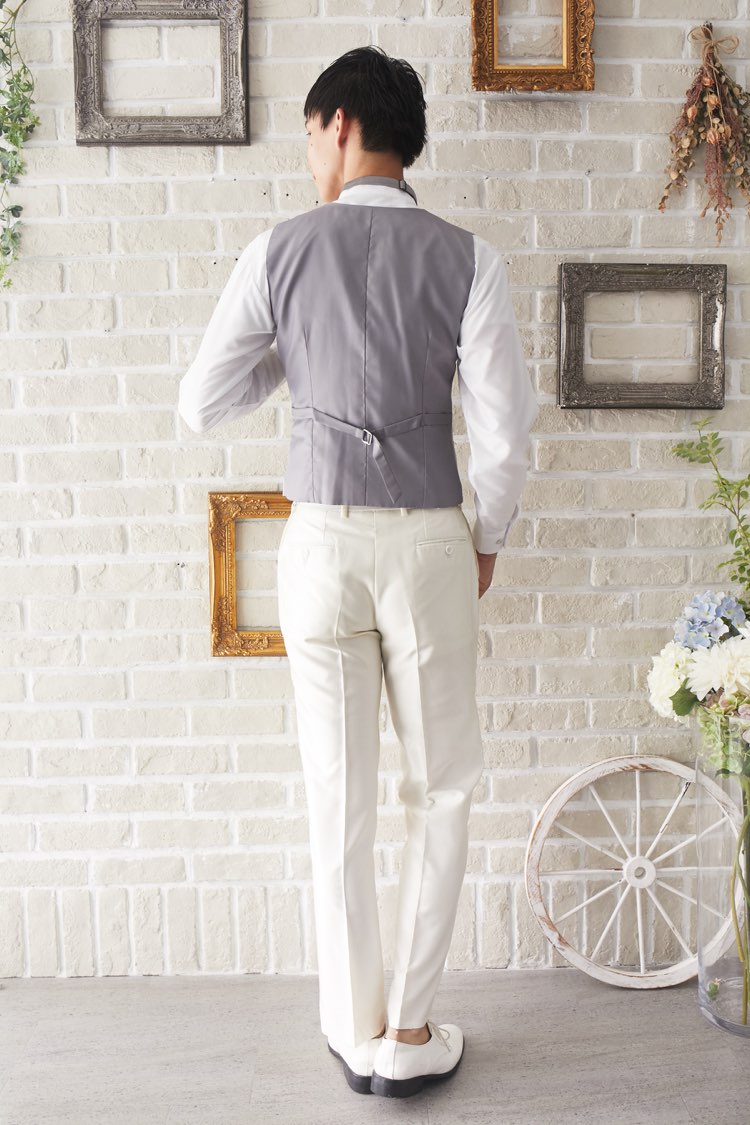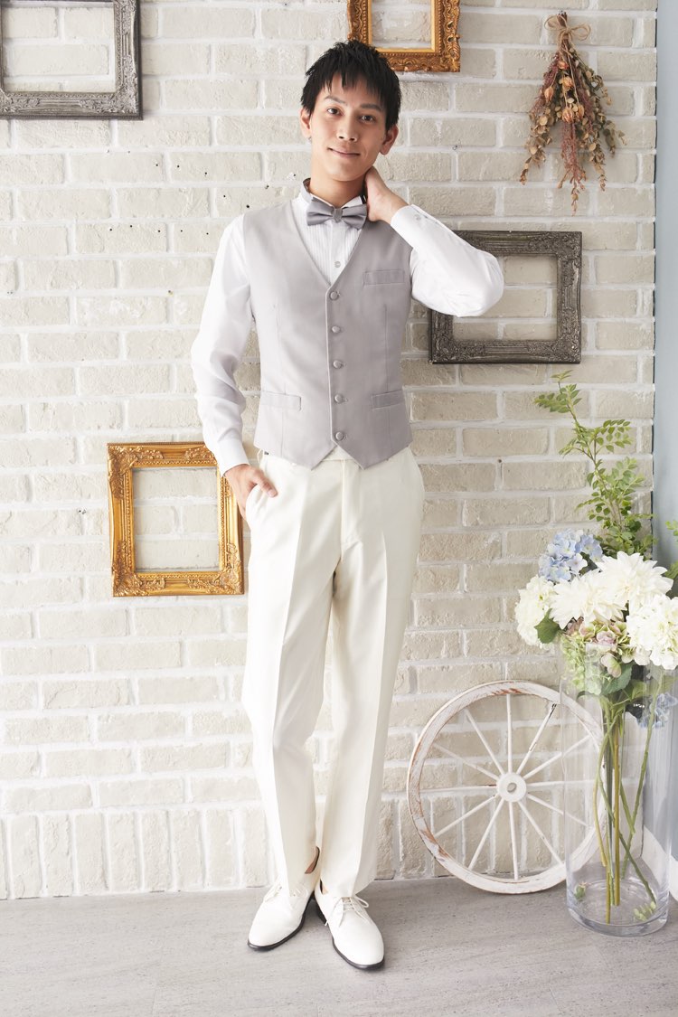 シンプルなライトグレーのベストです。ネイビー、ホワイト、ブラックなど無地のジャケットやパンツはもちろん、チェックやドット、花柄などどんなアイテムとも合わせやすい万能なベストです。ネイビー、ライトブルーなどのカラーシャツやギンガムチェックなどの柄シャツで合わせれば、カジュアルな二次会タキシードとしてもオシャレに仕上がります。また、白のウィングカラーシャツを合わせればきちんとした結婚式や披露宴向けのフォーマルなコーディネートになります。二次会ウェディング・海外やフォトウェディング、前撮りにまで幅広いシーンでご使用いただけます。結婚式お呼ばれや会社の懇親会などのパーティーにも。オールシーズンに適してます。