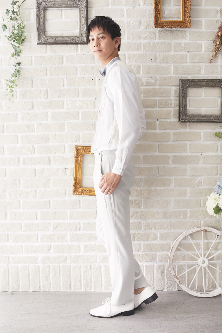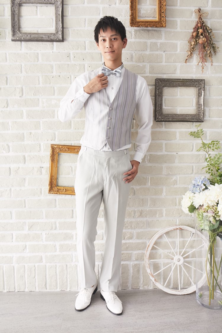 シルバーグレー×パープルのストライプ柄ベストです。ネイビー、グレー、ホワイト、ブラックなど無地のジャケットやパンツと相性が良く、シンプルなタキシードのアクセントにオススメです。また、ネイビー、パープル、ライトグレーなどのカラーシャツで合わせてカジュアルな二次会タキシードとしてもオシャレに仕上がります。また、白のウィングカラーシャツを合わせればきちんとした結婚式や披露宴向けのフォーマルなコーディネートになります。二次会ウェディング・海外やフォトウェディング、前撮りにまで幅広いシーンでご使用いただけます。結婚式お呼ばれや会社の懇親会などのパーティーにも。オールシーズンに適してます。