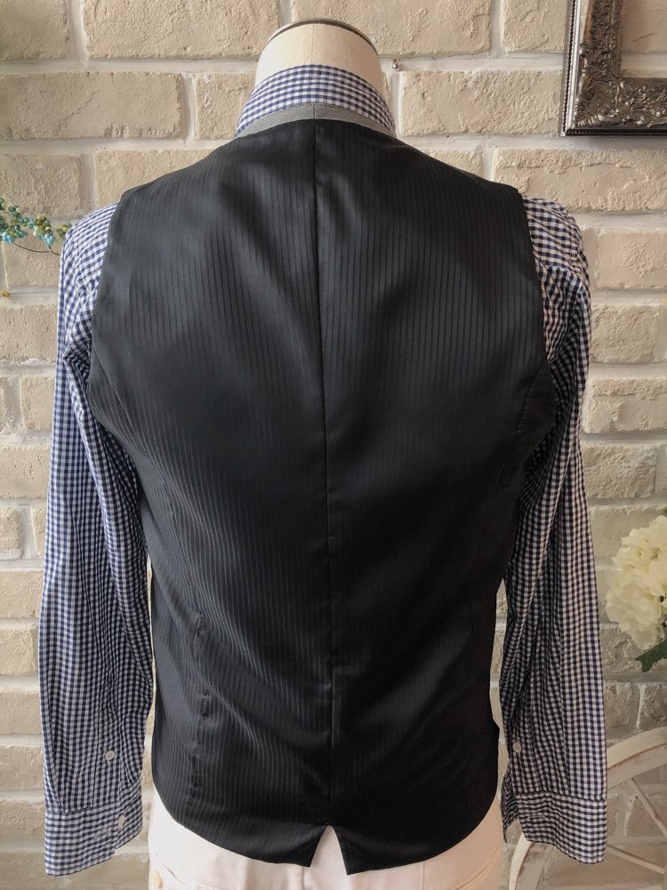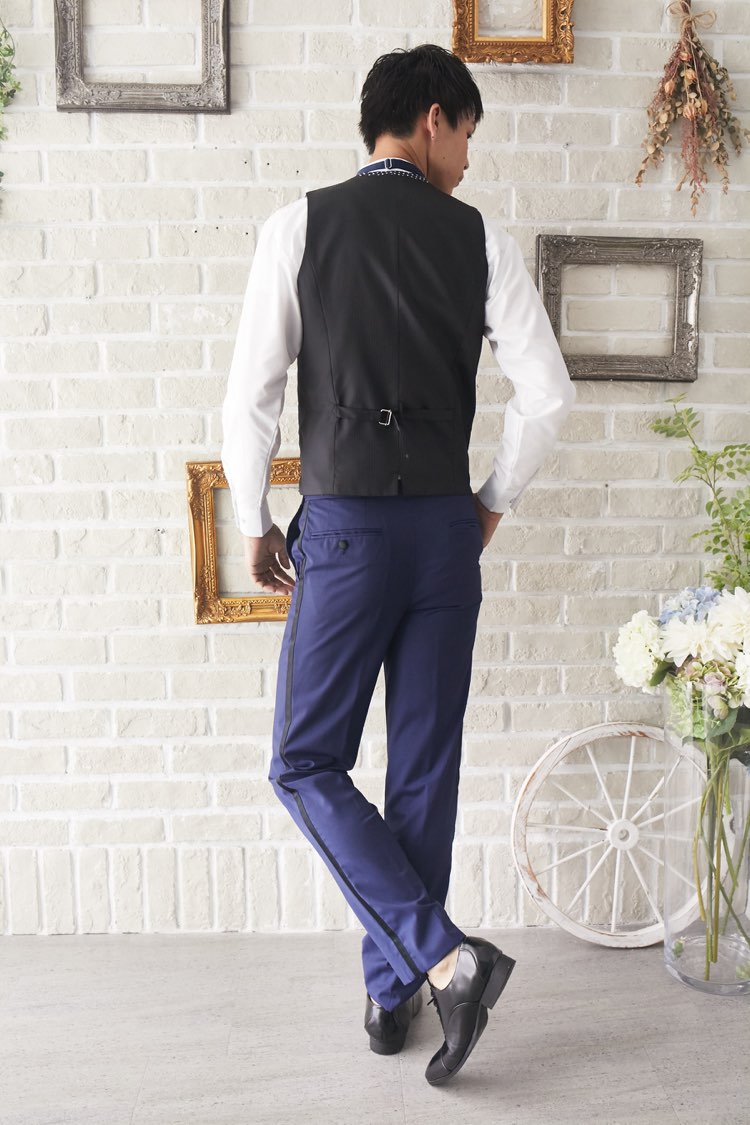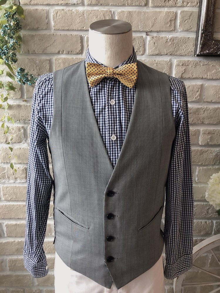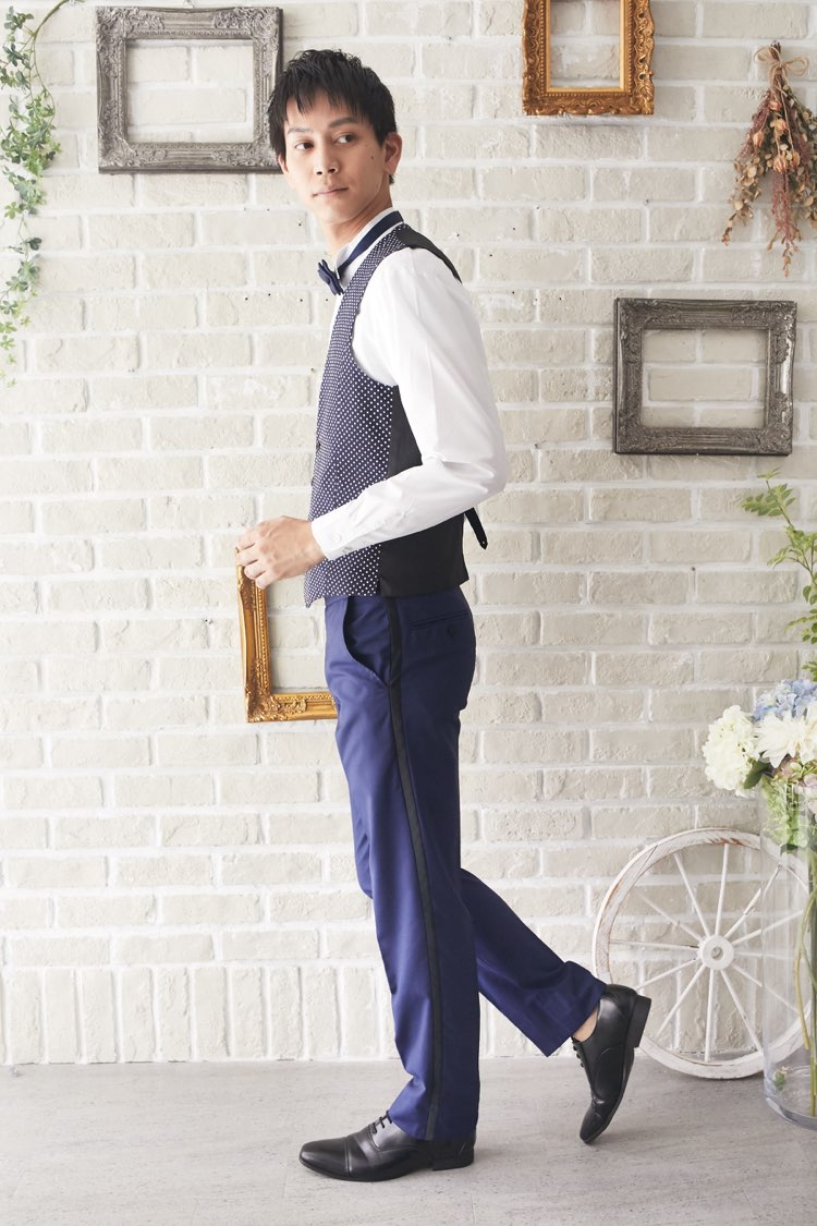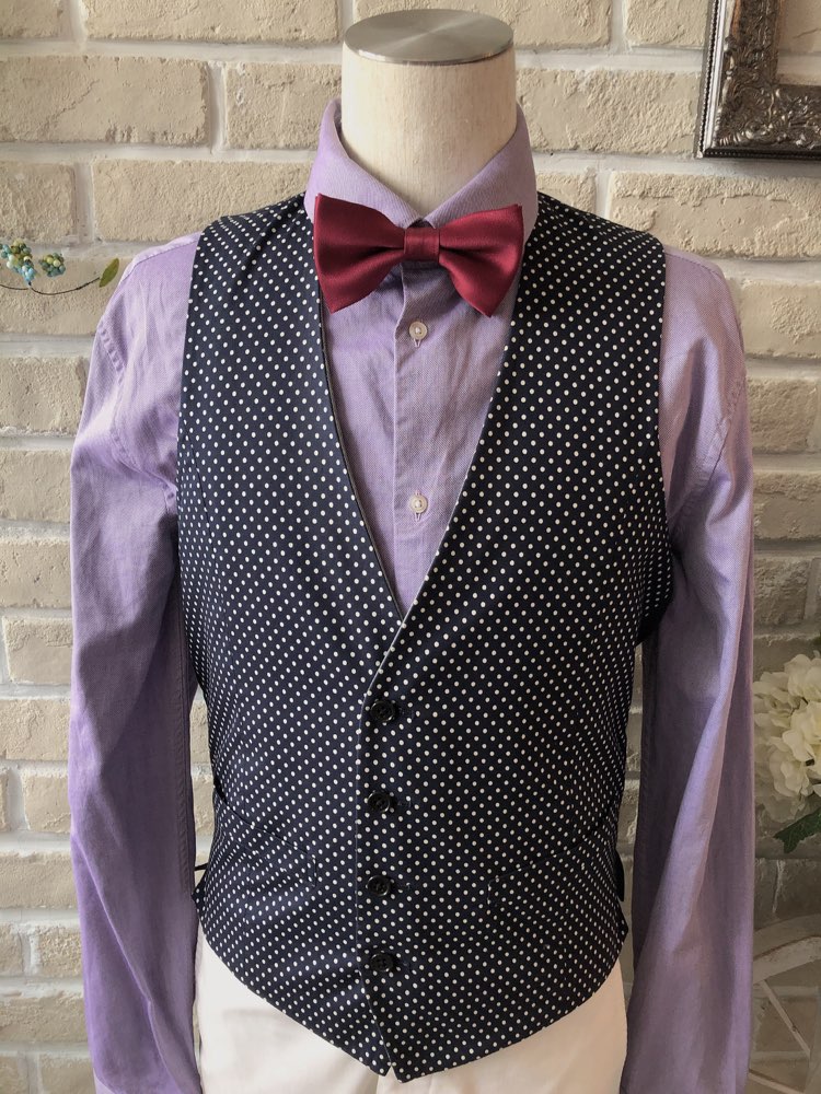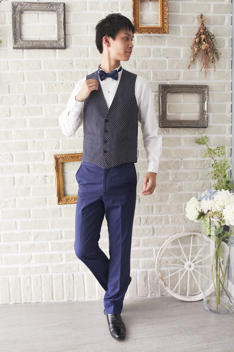 シンプルな無地のライトグレーデザインとネイビー×ホワイトドットデザインのリバーシブルベスト。背中はブラックです。ネイビー、グレー、ホワイト、ブラックなど無地のジャケットや、パンツはホワイトデニムや、グレー、ブラック、ネイビーの無地パンツでも合わせやすい万能なベストです。また合わせるシャツをデニム素材、細かなドット柄、ネイビー、ライトブルー、ライトグレーシャツで合わせてカジュアルな二次会タキシードとしても素敵。また白のウィングカラーシャツを合わせればきちんとした結婚式や披露宴向けのフォーマルなコーディネートになります。二次会ウェディング・海外やフォトウェディング、前撮りにまで幅広いシーンでご使用いただけます。結婚式お呼ばれや会社の懇親会などのパーティーにも。オールシーズンに適してます。