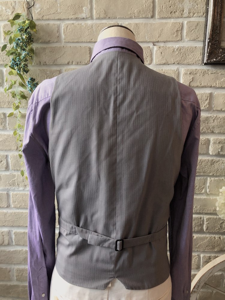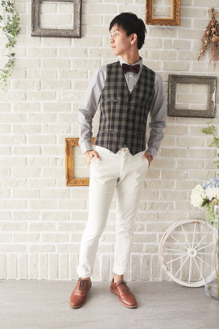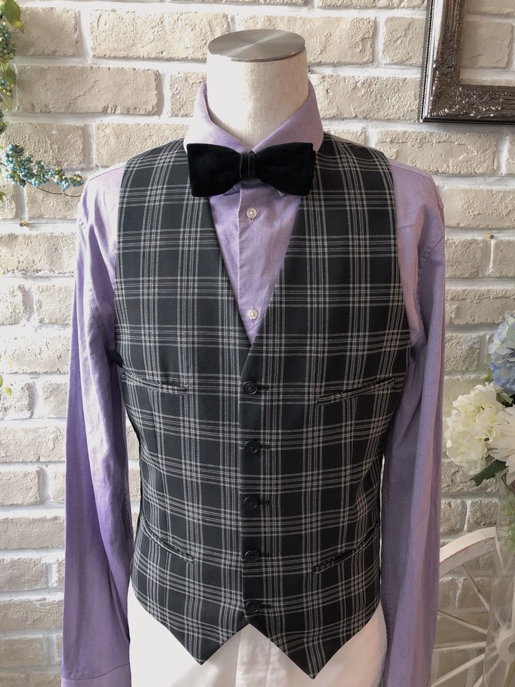 ライトグレーとブラックのチェック柄で何にでも合わせやすいオールシーズン向けのベスト。背中はブラックです。ネイビー、グレー、ホワイト、ブラックなど無地のジャケットや、パンツはホワイトデニムや、グレー、ブラック、ネイビーの無地パンツでも合わせやすい万能なチェックベストです。また合わせるシャツをデニム素材、細かなドット柄、ネイビー、ライトブルー、ライトグレーシャツで合わせてカジュアルな二次会タキシードとしても素敵。また白のウィングカラーシャツを合わせればきちんとした結婚式や披露宴向けのフォーマルなコーディネートになります※こちらの商品は、ベスト単品です。