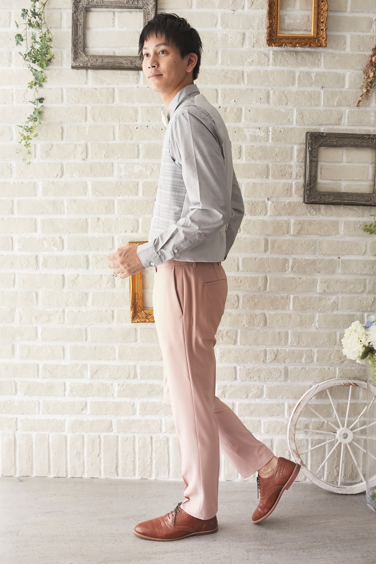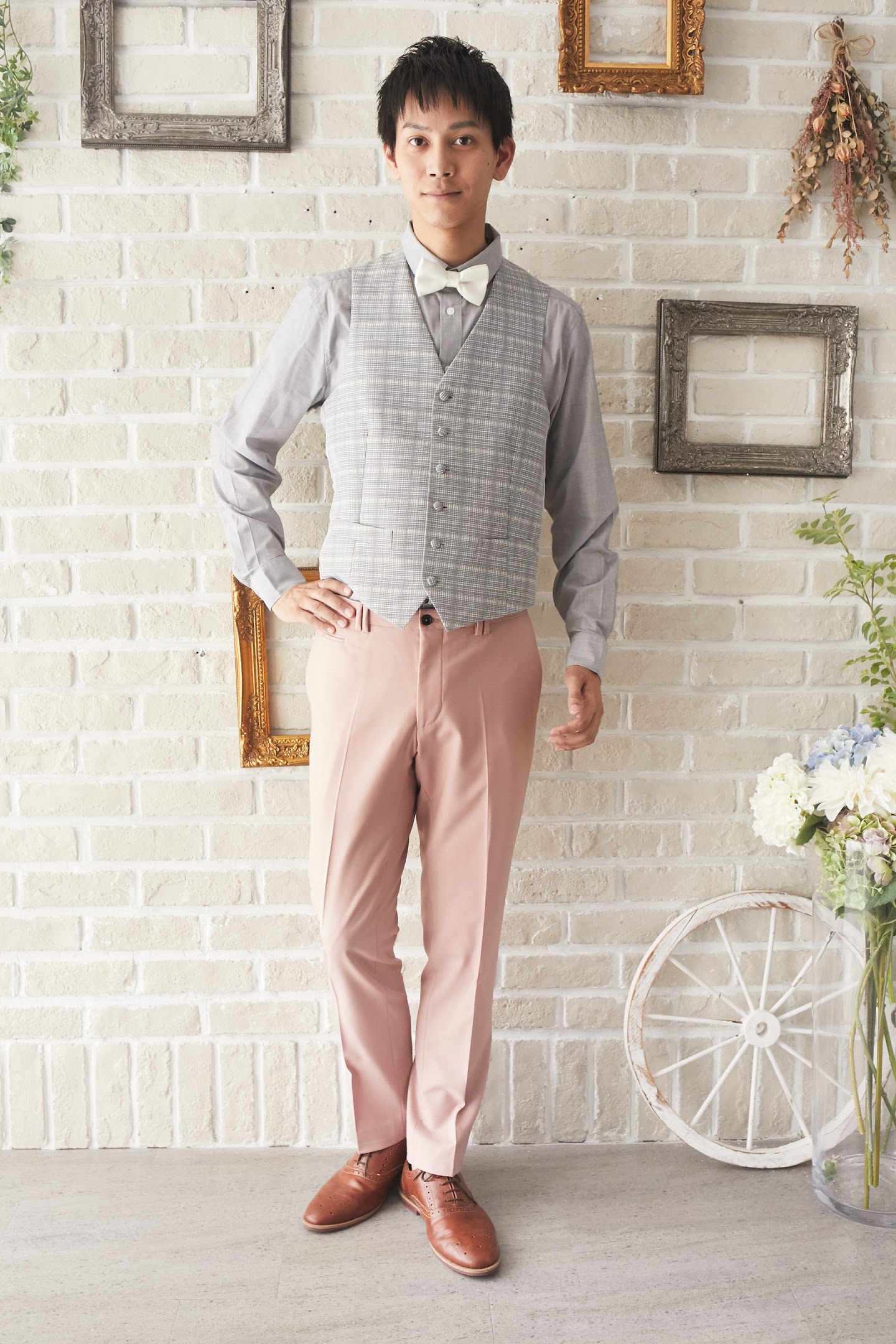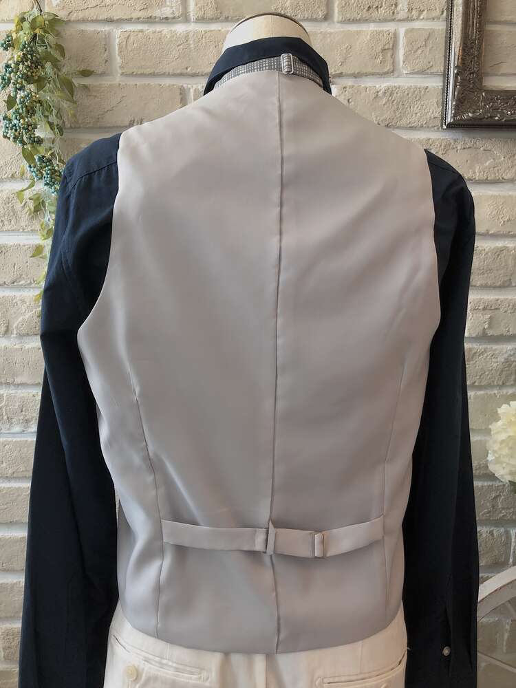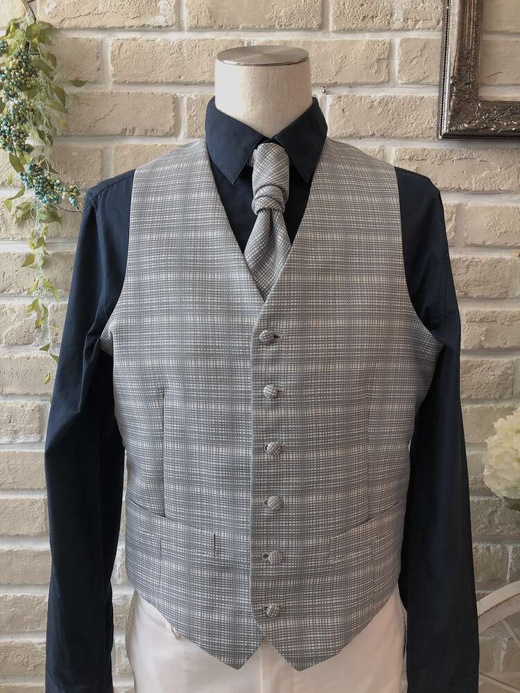 ライトグレーのチェック柄ベストです。ホワイト、ブラック、シルバー、グレーなどのオーソドックスな無地のジャケットやパンツに、白のウィングカラーシャツで合わせれば、きちんとした結婚式や披露宴向けのフォーマルなコーディネートになります。また、ネイビー、ボルドーやグリーンなどのカラーとも相性が良く、カラーシャツに蝶ネクタイで合わせてカジュアルな二次会タキシードとしてもオシャレに仕上がります。二次会ウェディング・海外やフォトウェディング、前撮りにまで幅広いシーンでご使用いただけます。結婚式お呼ばれや会社の懇親会などのパーティーにも。オールシーズンに適してます。