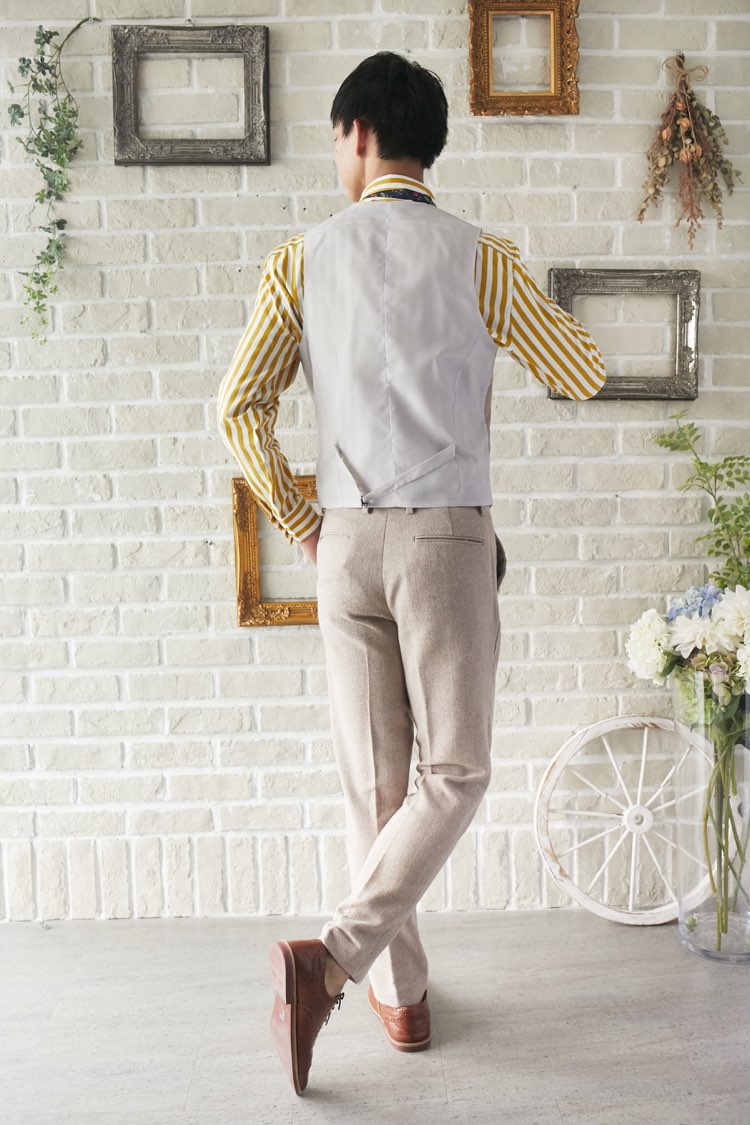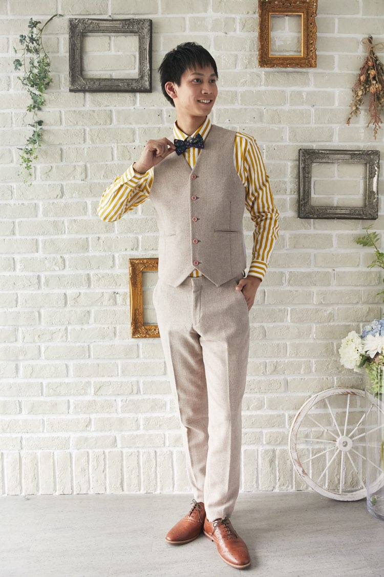 優しいピンクベージュのベストです。少し厚手の素材。シリーズは、ジャケット、ベスト、パンツの3ピースの展開。3ピースに白のウィングカラーシャツで合わせればきちんとしたフォーマルな装いに。シンプルなデザインですので、どんなアイテムとも相性が良く合わせやすいです。無地のグレーやブラウンのスラックスやホワイトのチノパン、チェック柄のパンツとも相性良いです。チェックやストライプ柄やネイビー、グレー、ライトブルーなどのジャケットで合わせたり、ジャケットをシンプルにして、チェック、ドット、ストライプ、花柄、マスタードイエロー、グレーシャツで合わせてカジュアルな二次会タキシードとしてもオシャレに仕上がります。また、裏地が花柄になっていてちらっと見えてもおしゃれですよ。二次会ウェディング・海外やフォトウェディング、前撮りにまで幅広いシーンでご使用いただけます。結婚式お呼ばれや謝恩会、会社の懇親会などのパーティーにも。オールシーズン適していますが、特に秋冬シーズンにオススメです。