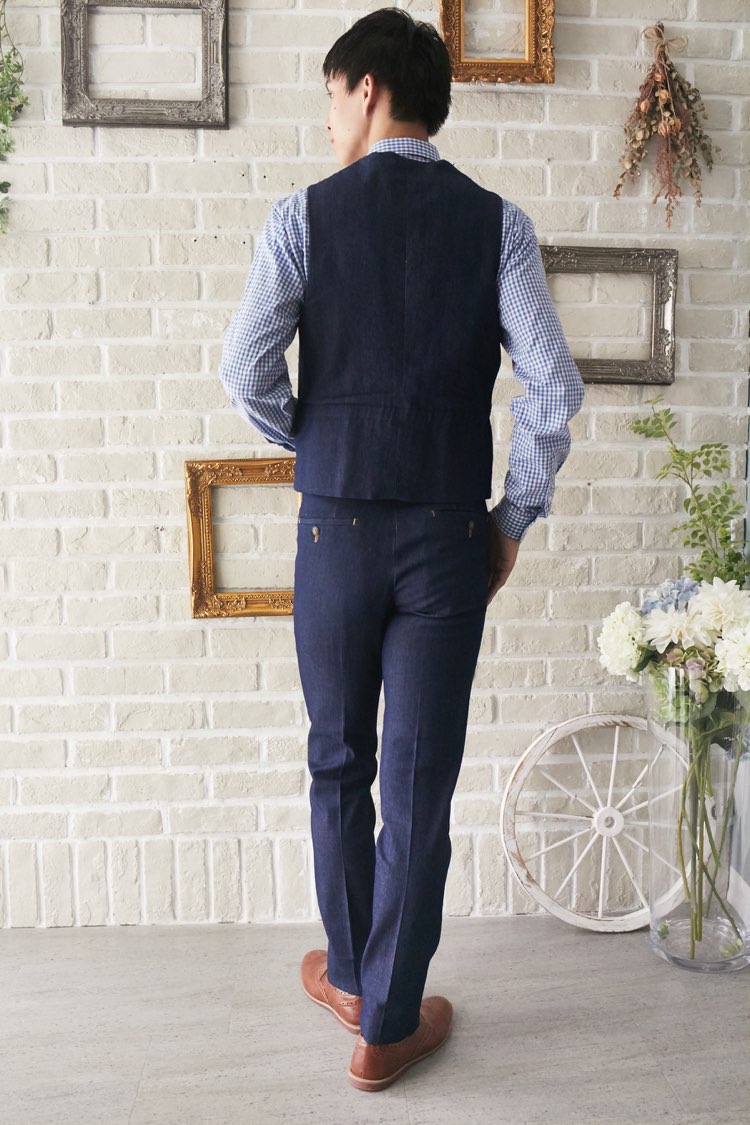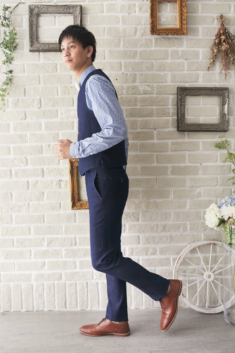 人気のデニムシリーズ。ステッチ入りノンウォッシュデニムのベストです。裏地がギンガムチェックで、ウエストは内側のゴムで調整可能です。シリーズは、ジャケット、ベスト、パンツの3ピースの展開。3ピースに白のウィングカラーシャツで合わせればきちんとしたフォーマルな装いに。ホワイトのパンツで合わせれば爽やかなコーディネートになります。水色やピンク、ミントグリーンなどのカラーシャツやギンガムチェックやドット、花柄のシャツで合わせてカジュアルな二次会タキシードとしてもオシャレに仕上がります。二次会ウェディング・海外やフォトウェディング、前撮りにまで幅広いシーンでご使用いただけます。結婚式お呼ばれや会社の懇親会などのパーティーにも。オールシーズンに適してます。