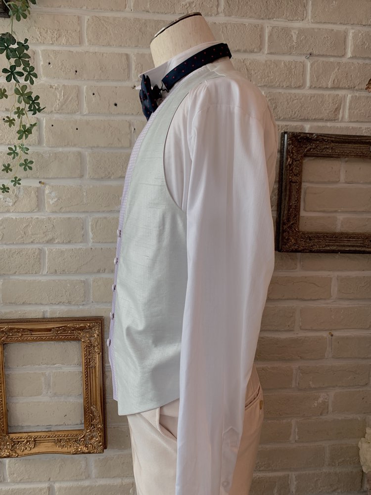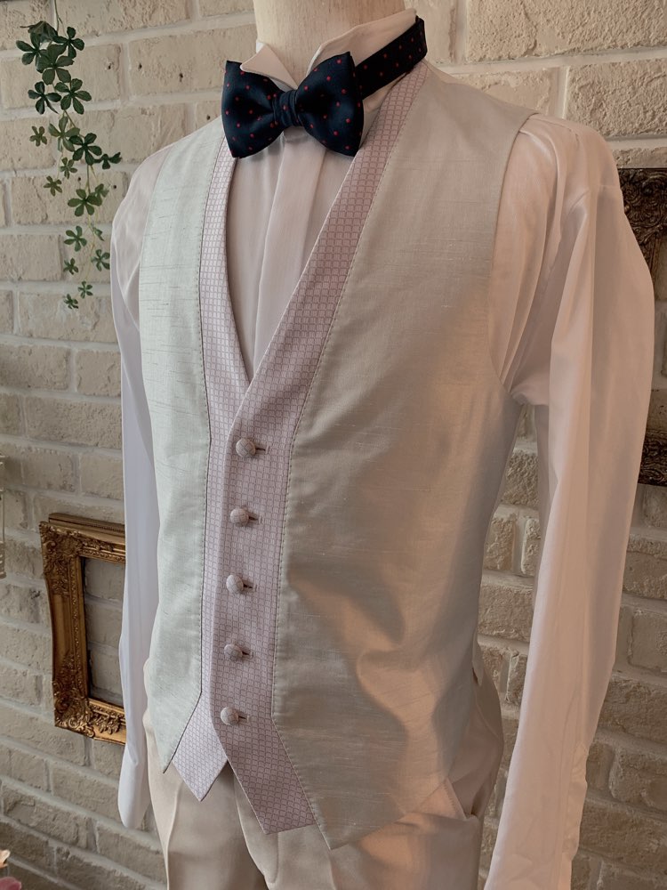 シルバー×ピンクチェックのパイピングベストです。ネイビー、グレー、ホワイトなど無地のジャケットやパンツと相性が良く、シンプルなタキシードに柄物を取り入れることで華やかな印象に仕上がります。また、ネイビー、ライトブルー、ライトグレーなどのカラーシャツで合わせてカジュアルな二次会タキシードとしてもオシャレです。また、白のウィングカラーシャツを合わせればきちんとした結婚式や披露宴向けのフォーマルなコーディネートになります。二次会ウェディング・海外やフォトウェディング、前撮りにまで幅広いシーンでご使用いただけます。結婚式お呼ばれや会社の懇親会などのパーティーにも。オールシーズンに適してます。
