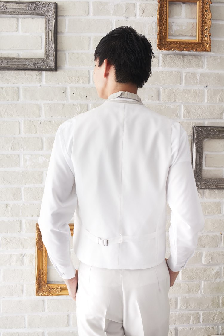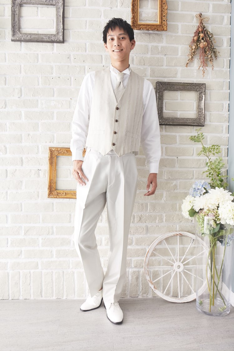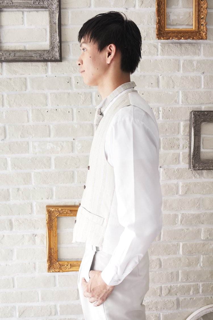 アイボリー色のストライプ柄ベストです。ネイビー、グレー、ホワイト、ブラックなど無地のジャケットや、パンツはホワイトや、グレー、ブラック、ネイビーの無地パンツでも合わせやすい万能なベストです。また、白のウィングカラーシャツを合わせればきちんとした結婚式や披露宴向けのフォーマルなコーディネートになります。二次会ウェディング・海外やフォトウェディング、前撮りにまで幅広いシーンでご使用いただけます。結婚式お呼ばれや会社の懇親会などのパーティーにも。オールシーズンに適してます。