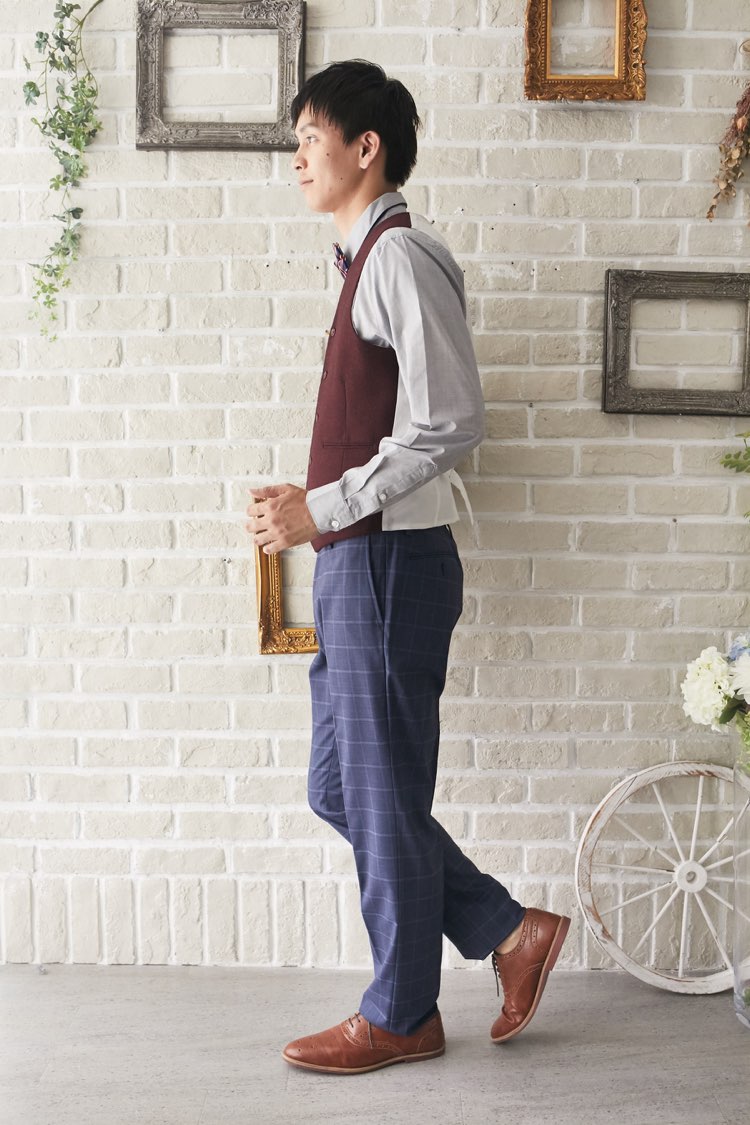 ボルドーのツイード素材のベスト。ネイビー、グレー、ホワイト、ブラックなど無地のジャケットや、パンツはホワイトデニムや、グレー、ブラック、ネイビーの無地パンツでも合わせやすい万能なベストです。また合わせるシャツをデニム素材、細かなドット柄、ネイビー、ライトブルー、ライトグレーシャツで合わせてカジュアルな二次会タキシードとしてもオシャレに仕上がります。また、白のウィングカラーシャツを合わせればきちんとした結婚式や披露宴向けのフォーマルなコーディネートになります。二次会ウェディング・海外やフォトウェディング、前撮りにまで幅広いシーンでご使用いただけます。結婚式お呼ばれや会社の懇親会などのパーティーにも。オールシーズンに適してます。
