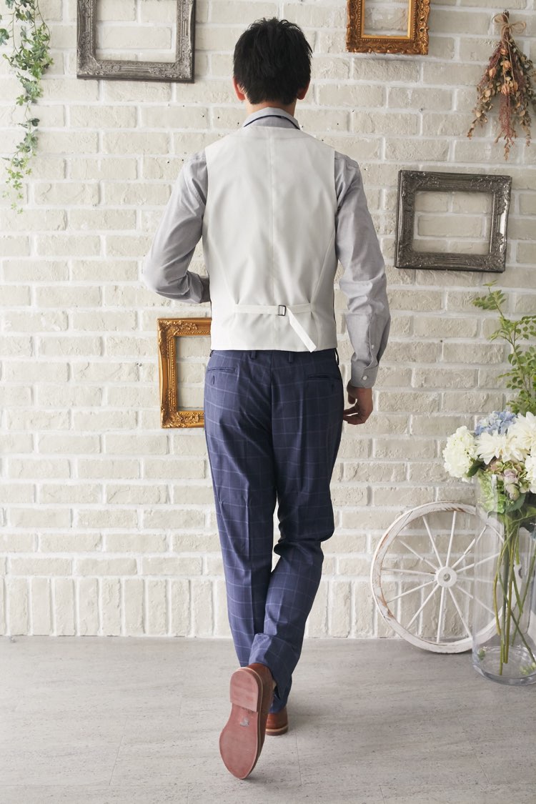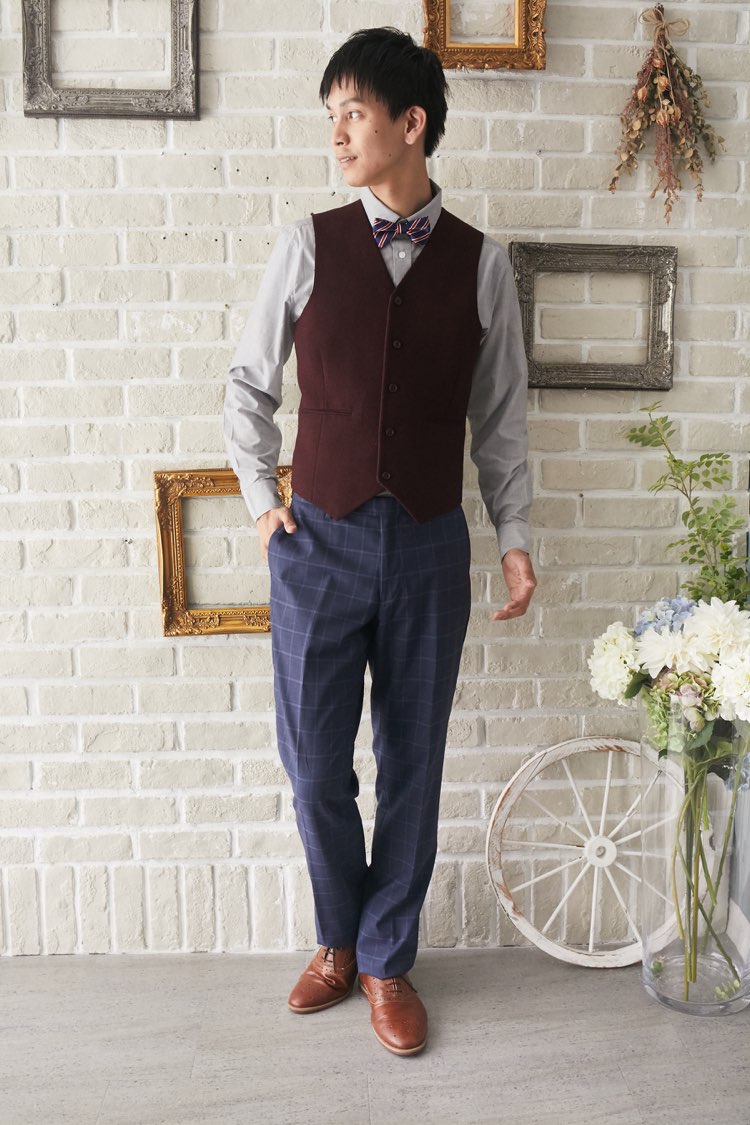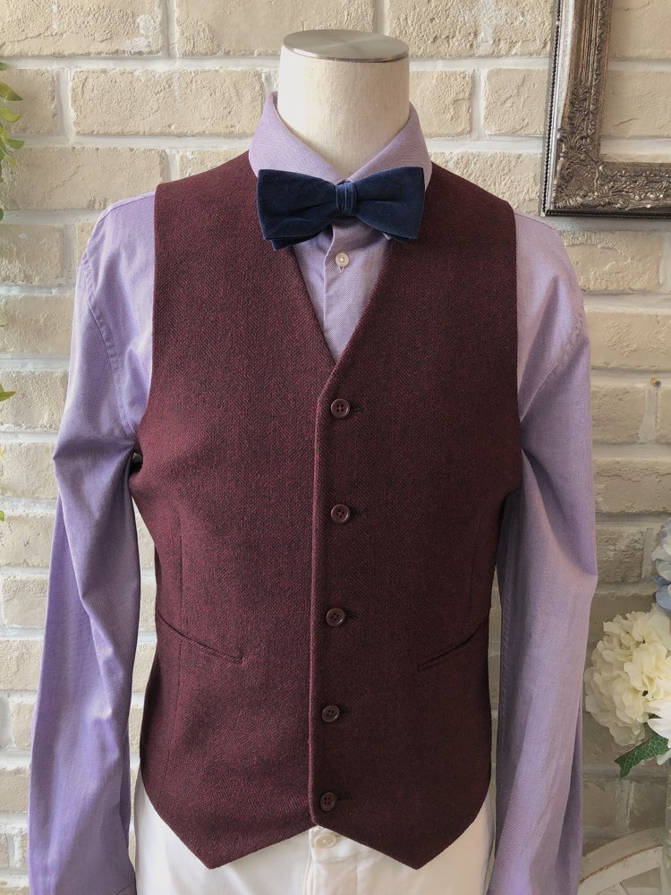 ボルドーのツイード素材のベスト。ネイビー、グレー、ホワイト、ブラックなど無地のジャケットや、パンツはホワイトデニムや、グレー、ブラック、ネイビーの無地パンツでも合わせやすい万能なベストです。また合わせるシャツをデニム素材、細かなドット柄、ネイビー、ライトブルー、ライトグレーシャツで合わせてカジュアルな二次会タキシードとしてもオシャレに仕上がります。また、白のウィングカラーシャツを合わせればきちんとした結婚式や披露宴向けのフォーマルなコーディネートになります。二次会ウェディング・海外やフォトウェディング、前撮りにまで幅広いシーンでご使用いただけます。結婚式お呼ばれや会社の懇親会などのパーティーにも。オールシーズンに適してます。