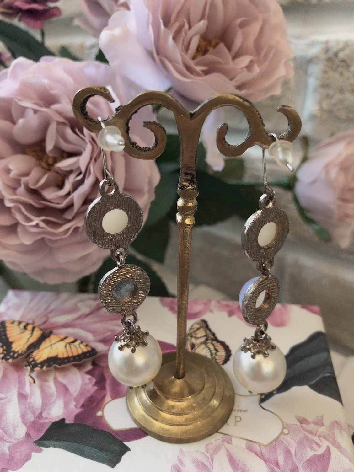 二種類の大粒パールと乳白ストーンが印象的な、とてもキュートなピアスです。遠くからでも程よく目立つボリューム感と上品さをかねそなえているので、結婚式や食事会、パーティーなど様々なシーンでお使い頂けます。お耳元がよく見えるアップスタイルはもちろん、ダウンスタイルなどコンパクトなシルエットのヘアスタイルと相性バツグンです。とても煌びやかながらなので、より一層お顔周りも華やかに引き立ちます。
