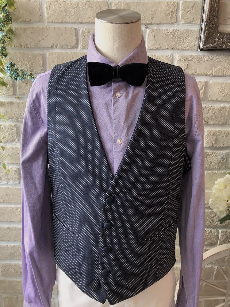 秋冬シーズンにオススメのベロア素材のネイビー無地のデザインとネイビー×ホワイトドットデザインのリバーシブルベスト。背中はブラックです。このベストは単品の展開です。ネイビー、グレー、ホワイト、ブラックなど無地のジャケットや、パンツはホワイトデニムや、グレー、ブラック、ネイビーの無地パンツでも合わせやすい万能なチェックベストです。また合わせるシャツをデニム素材、細かなドット柄、ネイビー、ライトブルー、ライトグレーシャツで合わせてカジュアルな二次会タキシードとしても素敵。また白のウィングカラーシャツを合わせればきちんとした結婚式や披露宴向けのフォーマルなコーディネートになります。二次会ウェディング・海外やフォトウェディング、前撮りにまで幅広いシーンでご使用いただけます。結婚式お呼ばれや会社の懇親会などのパーティーにも。オールシーズンに適してます。