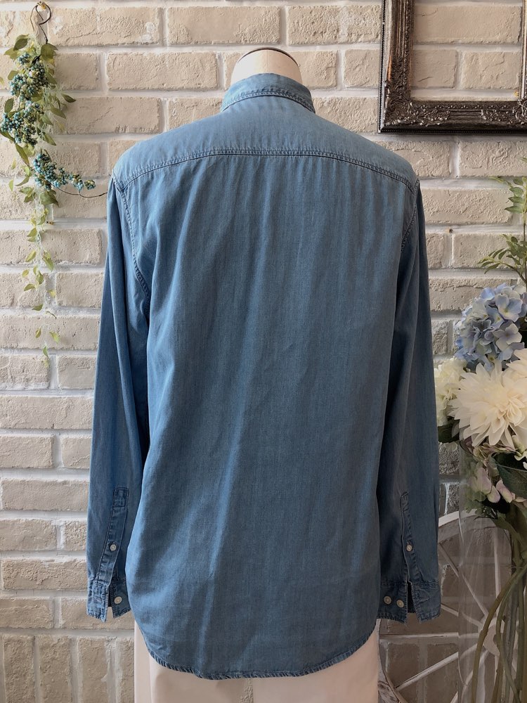 コットンデニム素材の長袖シャツ。カッタウェイカラーで、フレンチフロント。オープンタイプの片胸ポケット付き。バックヨーク付き。袖口周りをボタンで調節できます。裾はラウンドカット。レギュラーフィット―動きやすいゆとりがあり、ウエスト部分をゆるやかに絞ったクラシックなフィット。着心地のよいテーラードシルエットを創り出します。ホワイト、ネイビー、ピンク、ベージュ等のタキシード、ジャケットと相性が良く、中でも同じデニム素材で合わせるカジュアルスタイルのコーディネートがオシャレでオススメです。