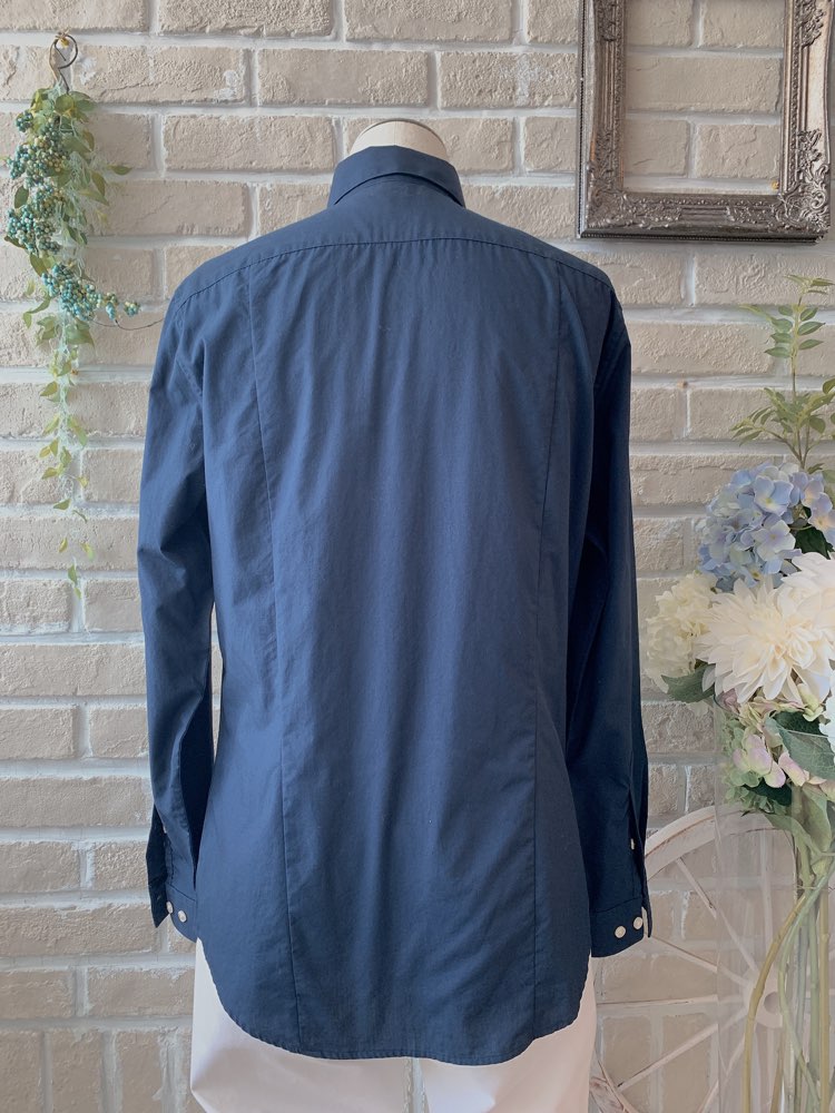 ※こちらの商品は、シャツ単品です。 ネイビーのコットン混素材の長袖シャツ。ブラック、ネイビー、ベージュ、グレー、ワインレッド、イエローやチェック柄やストライプ柄のタキシードやジャケットと相性良いです。イージーアイロン加工。ターンダウンカラー。フロントはクラシカルなスタイル。細いカフス付きで、袖口周りをボタンで調節できます。バックにダーツ入り。裾はラウンドカット。スリムフィット―肩幅が狭めで、ウエストを絞った細身のフィット。ボディラインに沿ったシルエットを創り出します。