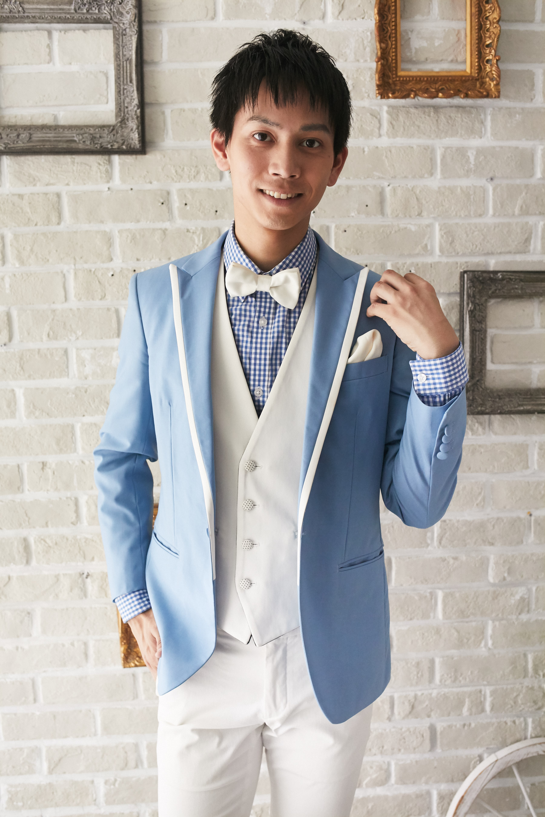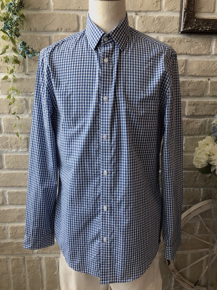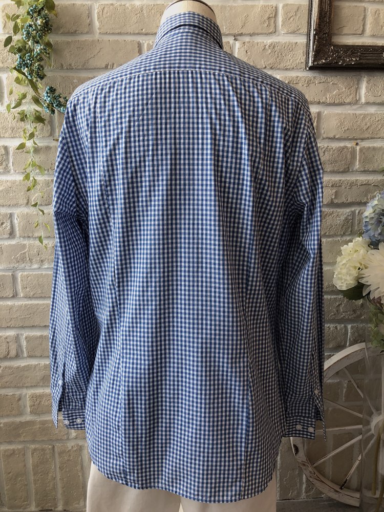 ※こちらの商品は、シャツ単品です。 ブルーのギンガムチェック柄のコットン混素材の長袖シャツ。ネイビー、ブルー、ホワイト、グレー、ピンク、シルバー等の無地タキシードやジャケットと相性が良いです。爽やかでカジュアルな着こなしをしたい方におすすめです。イージーアイロン加工でシワいらず。襟は定番のレギュラーカラー。袖口周りをボタンで調節できます。裾はラウンドカット。スリムフィット―肩幅が狭めで、ウエストを絞った細身のフィット。ボディラインに沿ったシルエットを創り出します。
