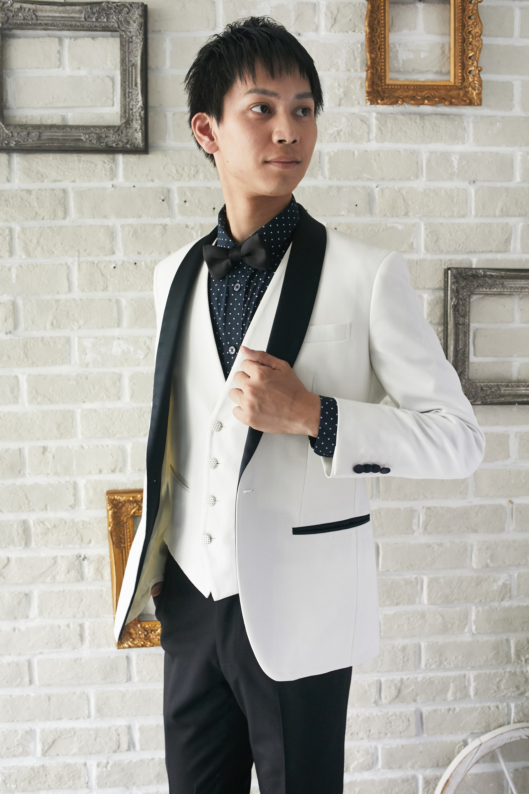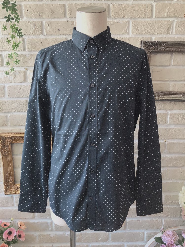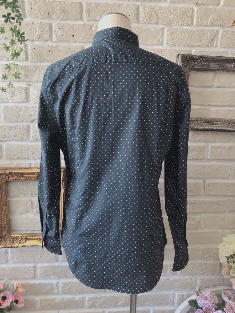 ネイビー×ホワイトの星柄がオシャレなポリエステル混紡素材の長袖シャツ。つるっとした生地感。レギュラーカラー。ブラック、ネイビー、ホワイト、グレー、ライトブルー、ブルー、ピンク等の無地タキシードやジャケットと相性が良いです。ノージャケットのベストスタイルもおすすめです。イージーアイロン加工でシワいらず。袖口周りをボタンで調節できます。裾はラウンドカット。レギュラーフィット―動きやすいゆとりがあり、ウエスト部分をゆるやかに絞ったクラシックなフィット。着心地のよいテーラードシルエットを創り出します。