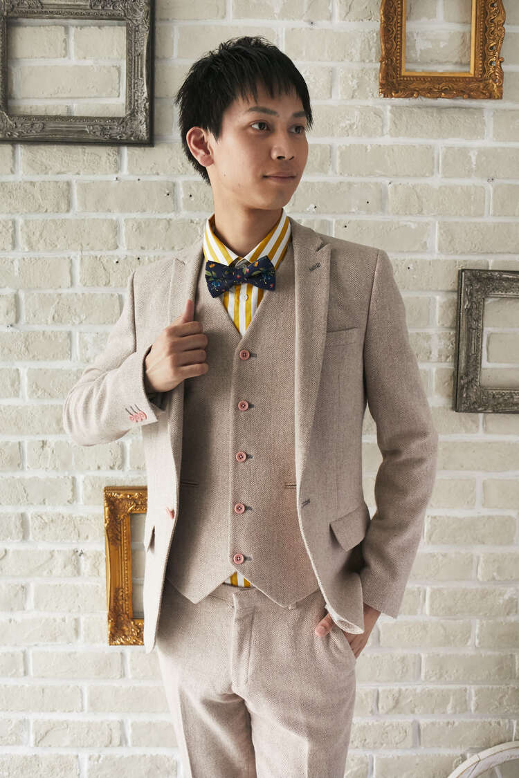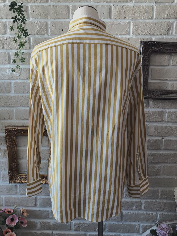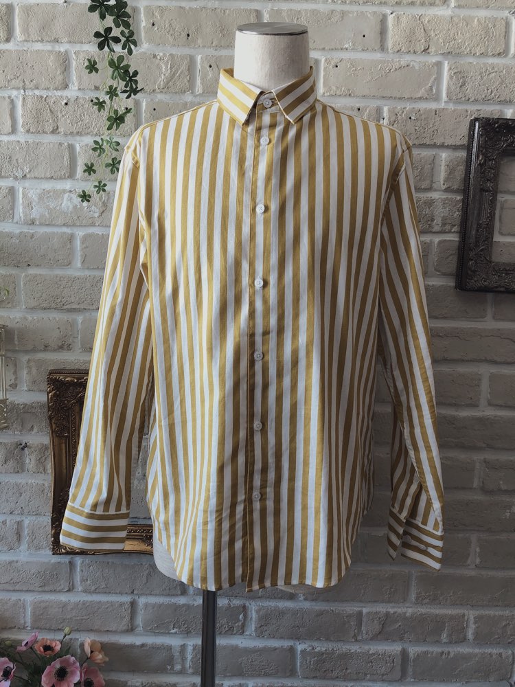 オフホワイト地にマスタードのようなくすんだイエローのストライプ柄コットン長袖シャツ。少し厚めのくしゅっとした素材感とボタンダウンカラーで、カジュアルなスタイル。オフホワイト、グリーン、ブルー、グレー、ベージュの無地のタキシードやジャケットと相性が良いです。また、ノージャケットのベストスタイル、サスペンダースタイルとも非常に相性が良く、特にナチュラル・ヴィンテージ風な着こなしをしたい方におすすめです。トレンドのドライフラワーともよく合います。裾はラウンドカット。左胸にポケットあり。レギュラーフィット―動きやすいゆとりがあり、ウエスト部分をゆるやかに絞ったクラシックなフィット。着心地のよいテーラードシルエットを創り出します。