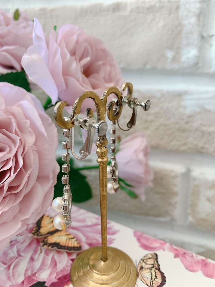 二粒のパールと小粒スワロフスキーを組み合わせたイヤリングです。程よいボリューム感と上品さをかねそなえているので、結婚式や食事会、パーティーなど様々なシーンでお使い頂けます。お耳元がよく見えるアップスタイルはもちろん、ダウンスタイルなどコンパクトなシルエットのヘアスタイルと相性バツグンです。シンプルなドレスと組み合わせれば、より一層お顔周りも華やかに引き立ちます。