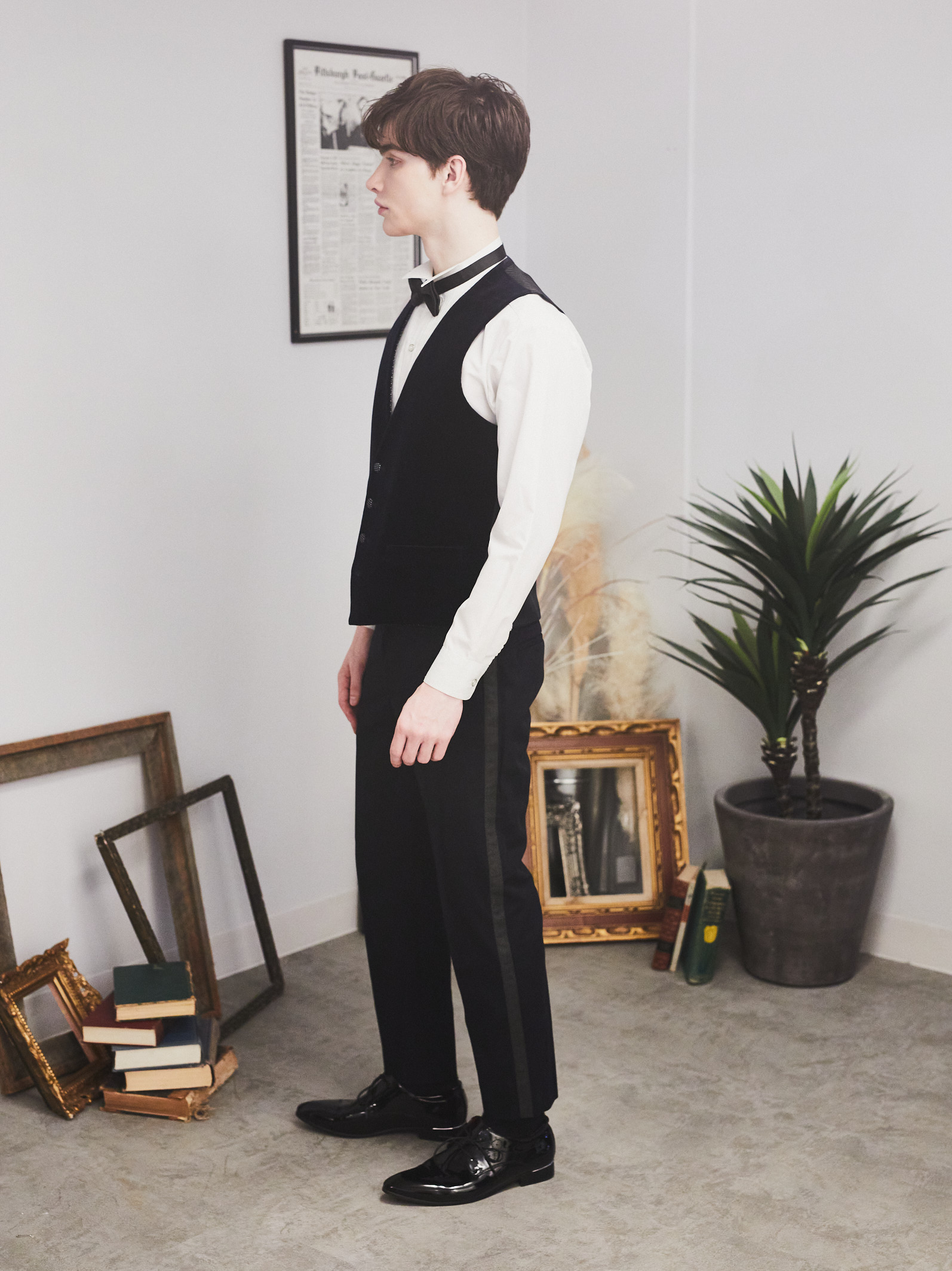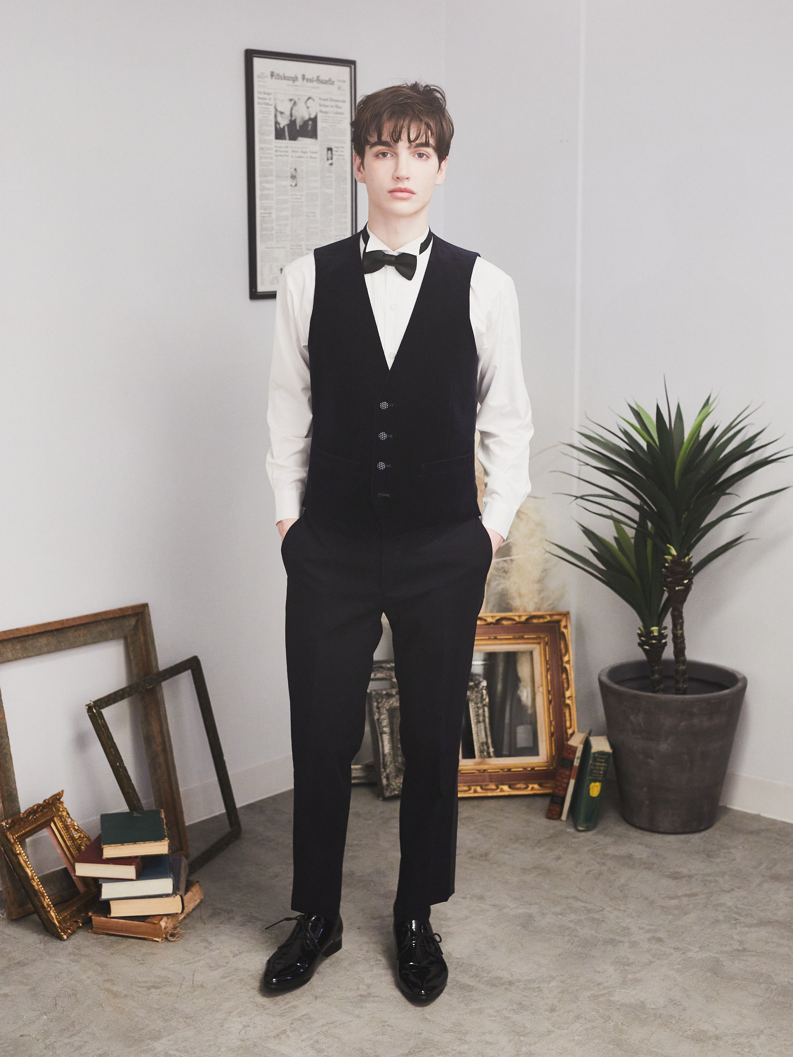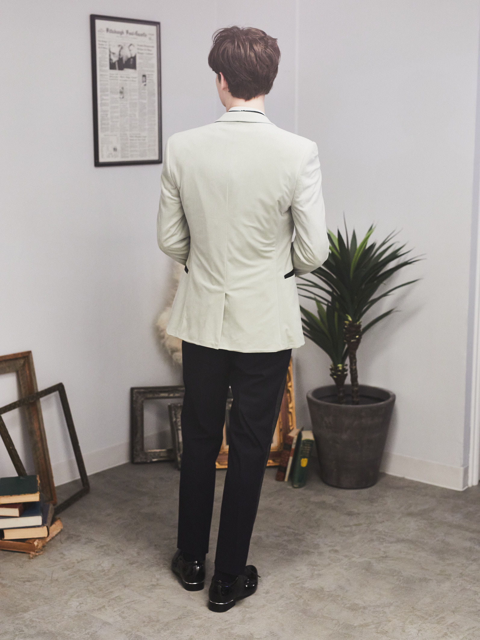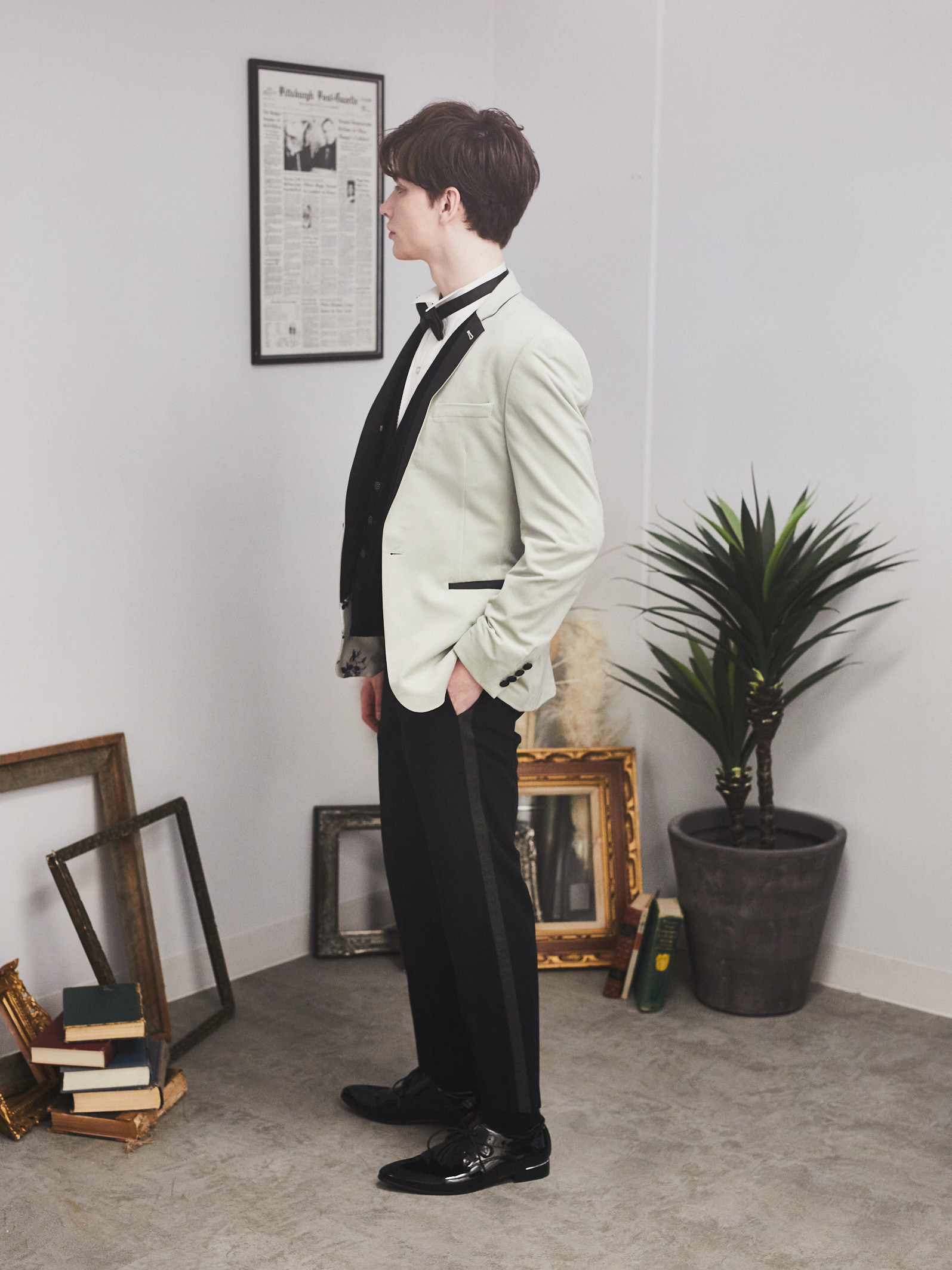 爽やか草原のような綺麗なミントグリーンのベロア素材のやや厚手のスーツ・ジャケット。下襟の先がとがったピークドラぺルタイプで、襟が黒のサテン地になっているのでフォーマル感もあります。こちらはジャケット単品の展開。パンツは無地のネイビー、ブラック、グレーのスラックスや、ホワイトデニムやチェック柄のパンツでも相性良いです。ベストはチェックやストライプ柄、スモーキーピンク、ライトグレー、ベージュ、シルバー、ブラック、ホワイトなどのベストを差し色として合わせるのもオススメです。合わせるシャツをチェック、ドット、ストライプ、花柄、ネイビー、ブラック、グレーシャツで合わせてカジュアルな二次会タキシードとしても素敵。また白のウィングカラーシャツを合わせればきちんとした結婚式や披露宴向けのフォーマルなコーディネートになります。二次会ウェディング・海外やフォトウェディング、前撮りにまで幅広いシーンでご使用いただけます。結婚式お呼ばれや会社の懇親会などのパーティーにも。秋冬のシーズンに適してます。