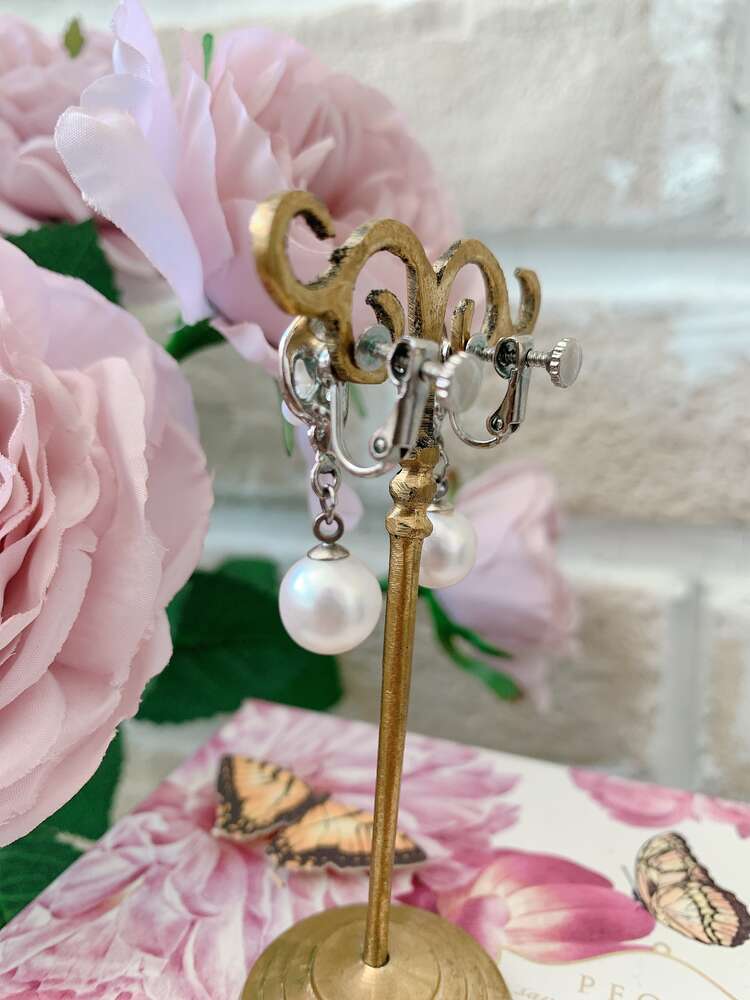 大きさの異なる二種類のパールと小粒スワロフスキーを組み合わせたイヤリングです。程よいボリューム感と上品さをかねそなえているので、結婚式や食事会、パーティーなど様々なシーンでお使い頂けます。アップスタイルはもちろん、ダウンスタイルなどコンパクトなシルエットのヘアスタイルと相性バツグンです。シンプルなドレスと組み合わせれば、より一層お顔周りも華やかに引き立ちます。