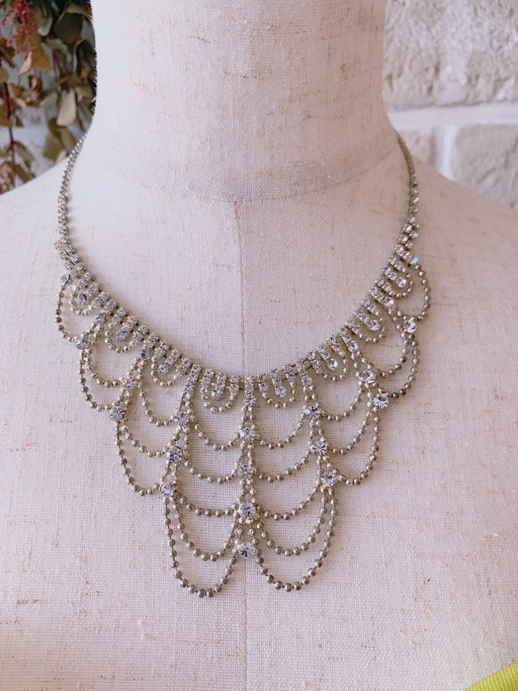 ボールチェーンと小粒スワロフスキーを組み合わせたシンプルなネックレスです。シルバーは、煌びやかながらも肌に馴染んで落ち着いた雰囲気にも良く合います。パーティーやお祝いの席にぴったりのほどよいボリューム感と華やかさが使いやすさ◎。 胸元のあきが気になるドレスにプラスすれば、デコルテを華やかに演出してくれます。調節可能なアジャスター付き。