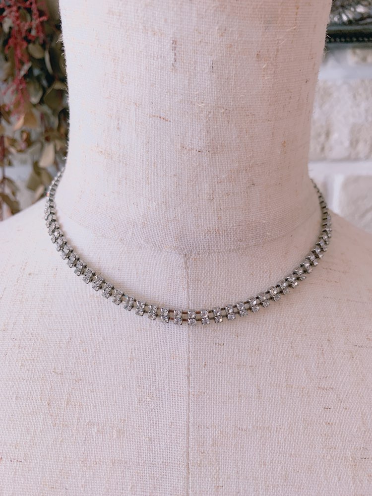 小粒のスワロフスキーを二列組み合わせたシンプルなチョーカータイプのネックレスです。シルバーは、煌びやかながらも肌に馴染んで落ち着いた雰囲気にも良く合います。パーティーやお祝いの席にぴったりのほどよいボリューム感と華やかさが使いやすさ◎。 首元がつまっているドレスに組み合わせれば、デコルテを華やかに演出してくれます。調節可能なアジャスター付き。
