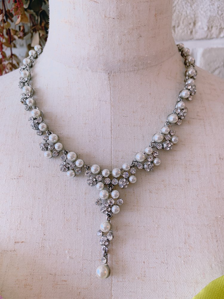 小粒パールとボール型のスワロフスキーを組み合わせたネックレスです。シルバー&パールは、煌びやかながらも肌に馴染んで落ち着いた雰囲気にも良く合います。パーティーやお祝いの席にぴったりのほどよいボリューム感と華やかさが使いやすさ◎。 胸元がVネックのドレスにプラスすれば、より一層デコルテを華やかに演出してくれます。調節可能なアジャスター付き。