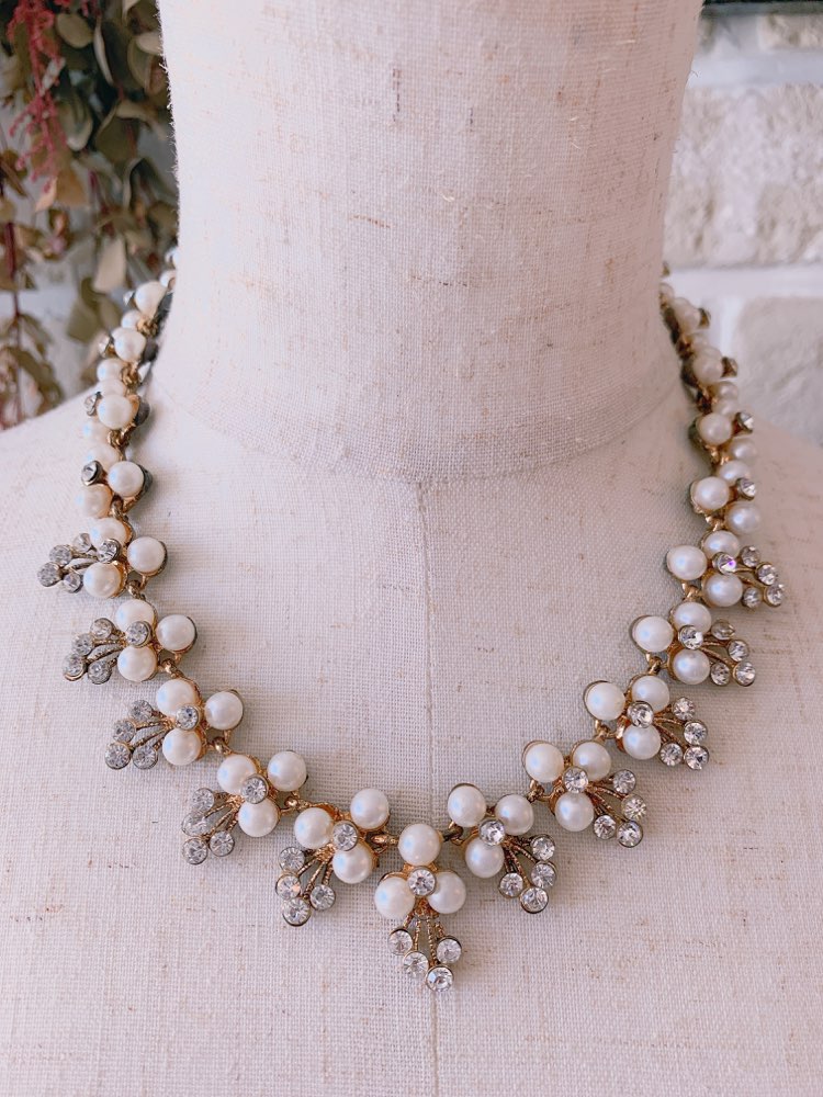 パールとスワロフスキーをちりばめたようなネックレスです。パールは、肌に馴染んで落ち着いた雰囲気にも良く合います。パーティーやお祝いの席にぴったりのほどよいボリューム感と華やかさが使いやすさ◎。 胸元のあきが気になるドレスにプラスすれば、デコルテを華やかに演出してくれます。調節可能なアジャスター付き。