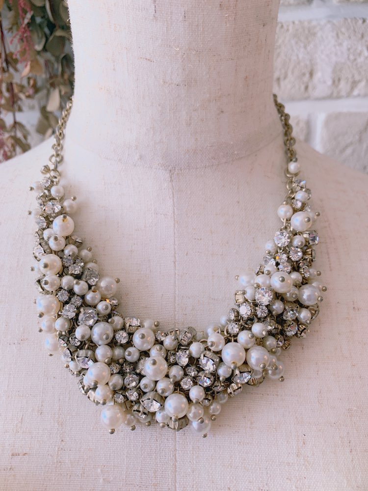 異なる大きさのパールとスワロフスキーをちりばめたようなボリュームのあるネックレスです。ゴールドは、肌に馴染んで落ち着いた雰囲気にも良く合います。パーティーやお祝いの席にぴったりのボリューム感と華やかさが使いやすさ◎。 胸元のあきが気になるドレスにプラスすれば、デコルテを華やかに演出してくれます。調節可能なアジャスター付き。