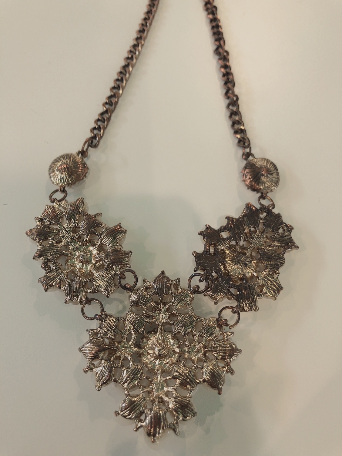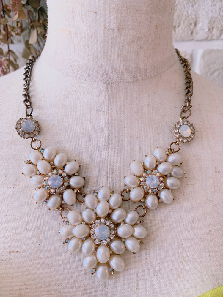 大きさの異なるお花をイメージしたパールと乳白色スワロフスキーを組み合わせた、ボリュームのあるネックレスです。パール&ゴールドは、肌に馴染んで落ち着いた雰囲気にも良く合います。パーティーやお祝いの席にぴったりのボリューム感と華やかさが使いやすさ◎。 胸元のあきが気になるドレスにプラスすれば、デコルテを華やかに演出してくれます。調節可能なアジャスター付き。