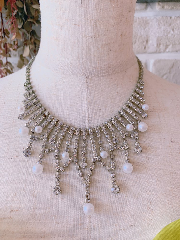 パールとスワロフスキーを組み合わせ、ちりばめたようなネックレスです。シルバーは、煌びやかながらも落ち着いた雰囲気にも良く合います。パーティーやお祝いの席にぴったりのほどよいボリューム感と華やかさが使いやすさ◎。 胸元のあきが気になるドレスにプラスすれば、デコルテを華やかに演出してくれます。調節可能なアジャスター付き。