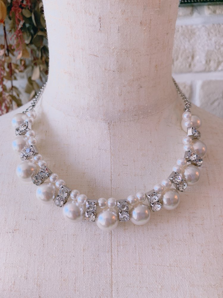 大きさの異なるパールとスワロフスキーを組み合わせたネックレスです。シルバーとパールは、肌に馴染んで落ち着いた雰囲気にも良く合います。パーティーやお祝いの席にぴったりのほどよいボリューム感と華やかさが使いやすさ◎。 胸元のあきが気になるドレスにプラスすれば、デコルテを華やかに演出してくれます。調節可能なアジャスター付き。