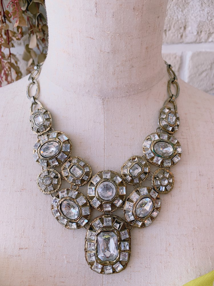 大きめスワロフスキーを組み合わせたボリュームのあるネックレスです。ゴールドは、肌に馴染んで落ち着いた雰囲気にも良く合います。パーティーやお祝いの席にぴったりのほどよいボリューム感と華やかさが使いやすさ◎。 胸元のあきが気になるドレスにプラスすれば、デコルテを華やかに演出してくれます。調節可能なアジャスター付き。