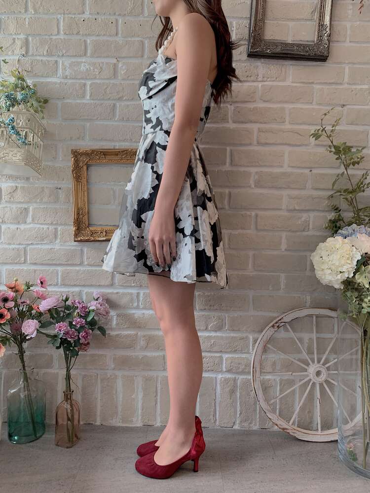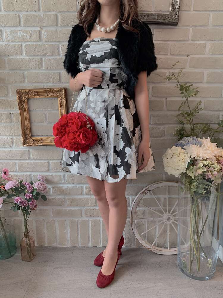 ベビーピンクとホワイトのバイカラーがおしゃれなミニドレスです。スカート全体に付いた小さなお花がとっても華やかでかわいいです。高いウェスト位置に切り替えになっているので脚長効果も抜群です。さらにほっそり見えるようにウェストにキラキラのビジューも付いています。パニエを入れることでよりふわっとして華やかになりますよ。