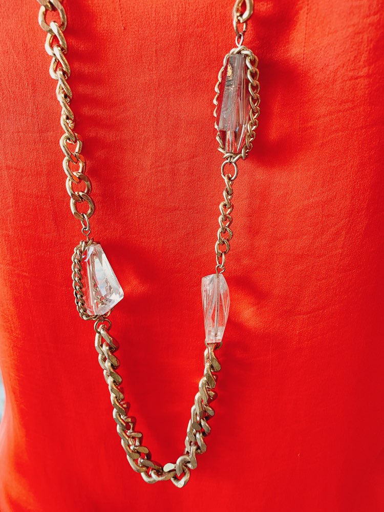 ゴールドチェーンと二色のクリスタルを組み合わせたロングネックレスです。ゴールドは、肌に馴染んで落ち着いた雰囲気にも良く合います。パーティーやお祝いの席にぴったりのほどよいボリューム感と華やかさが使いやすさ◎。 シンプルなドレスにプラスすれば、デコルテを華やかに演出してくれます。調節可能なアジャスター付き。