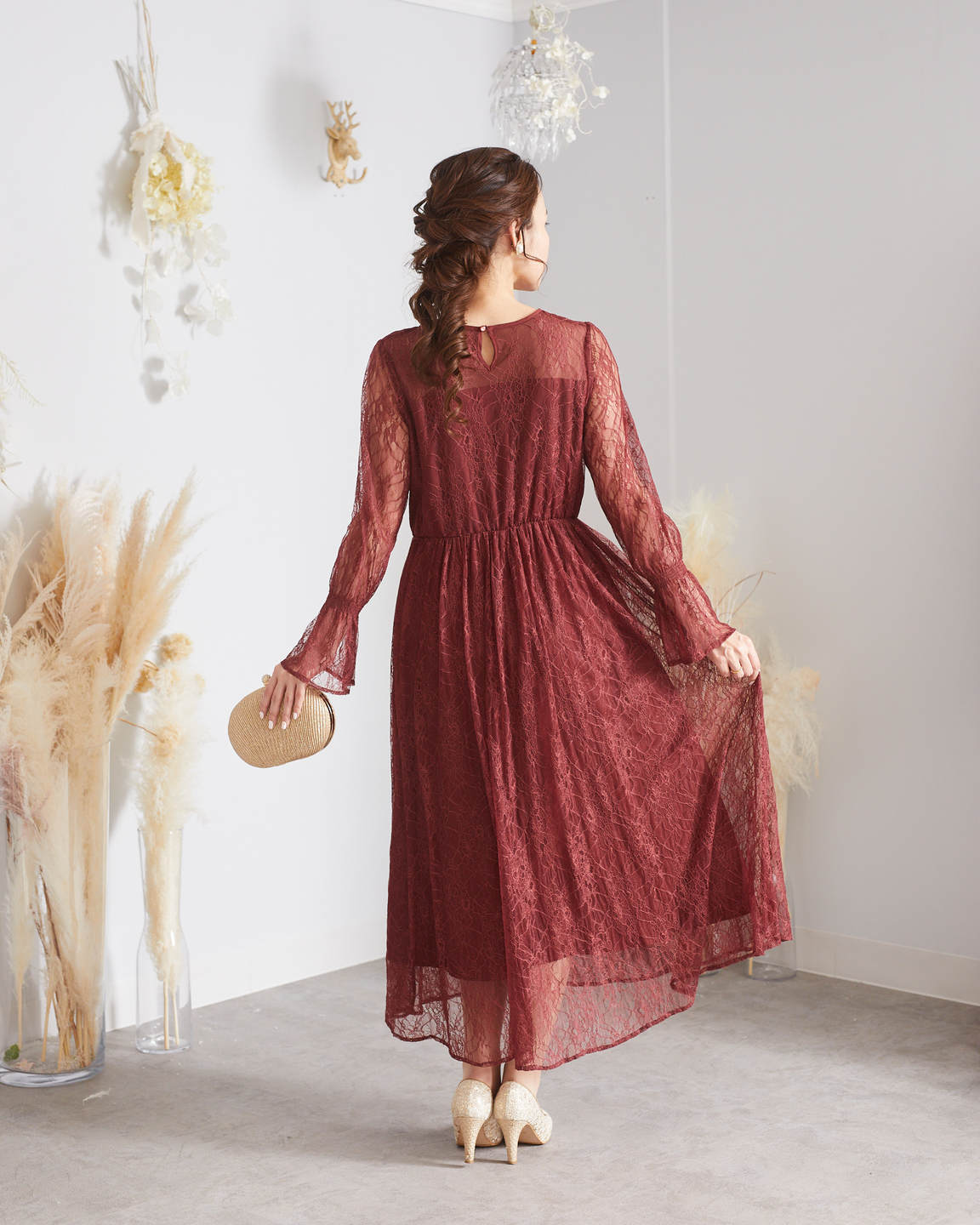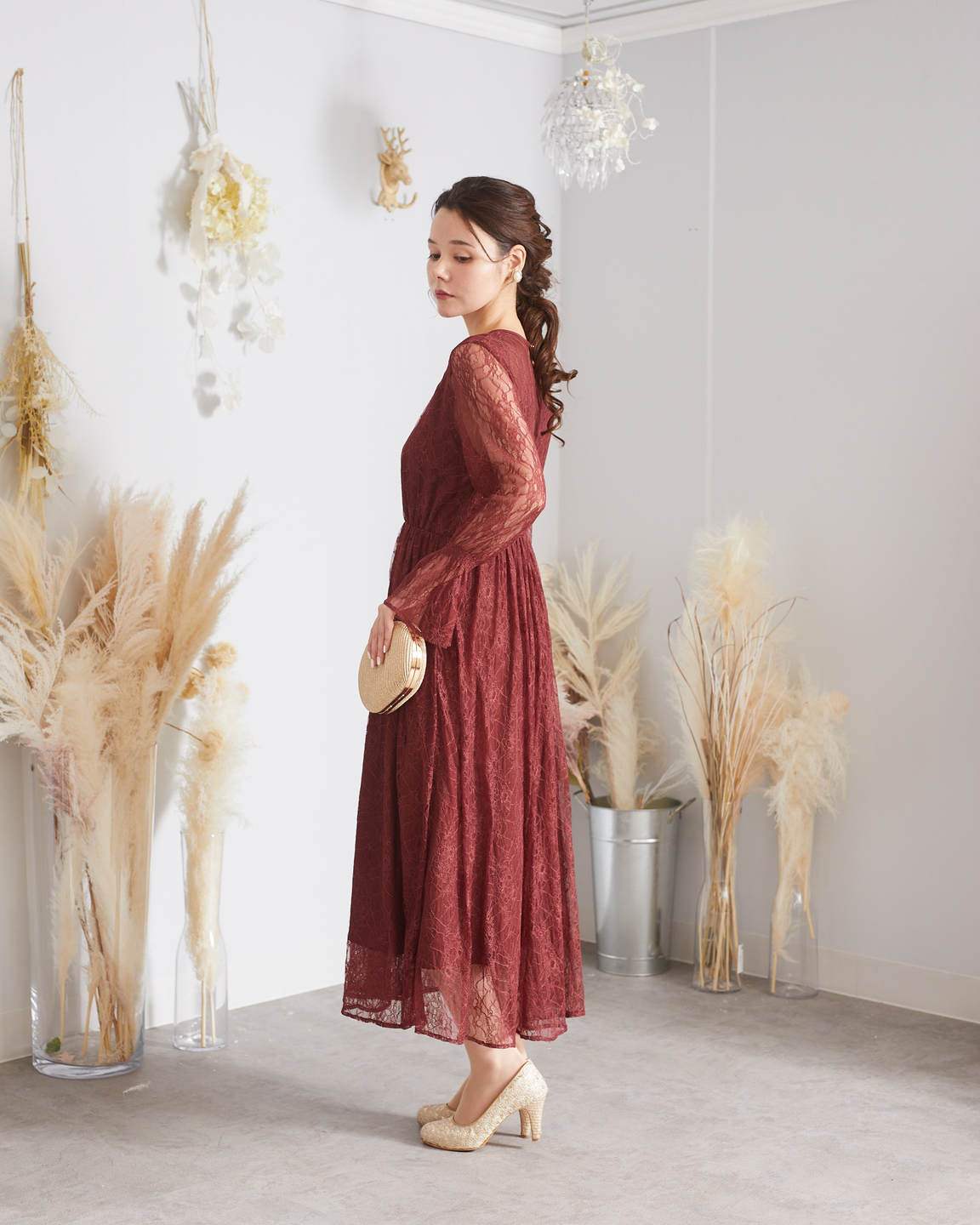 ボルドー総レース長袖アンクルドレス
