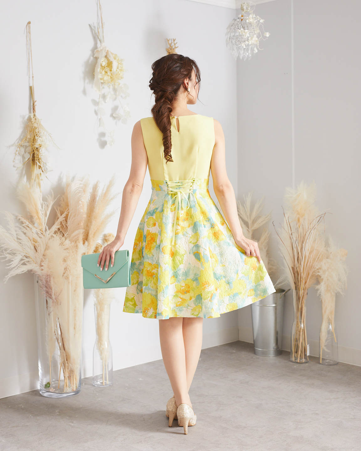 イエロー×花柄編み上げドレス