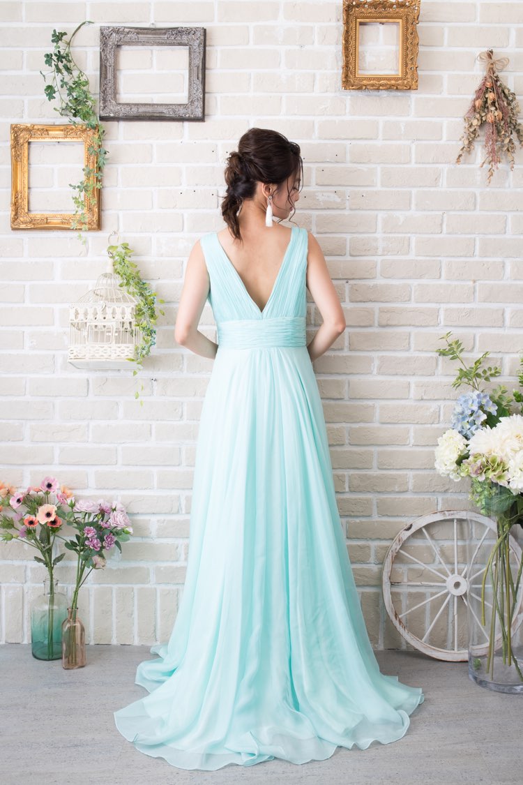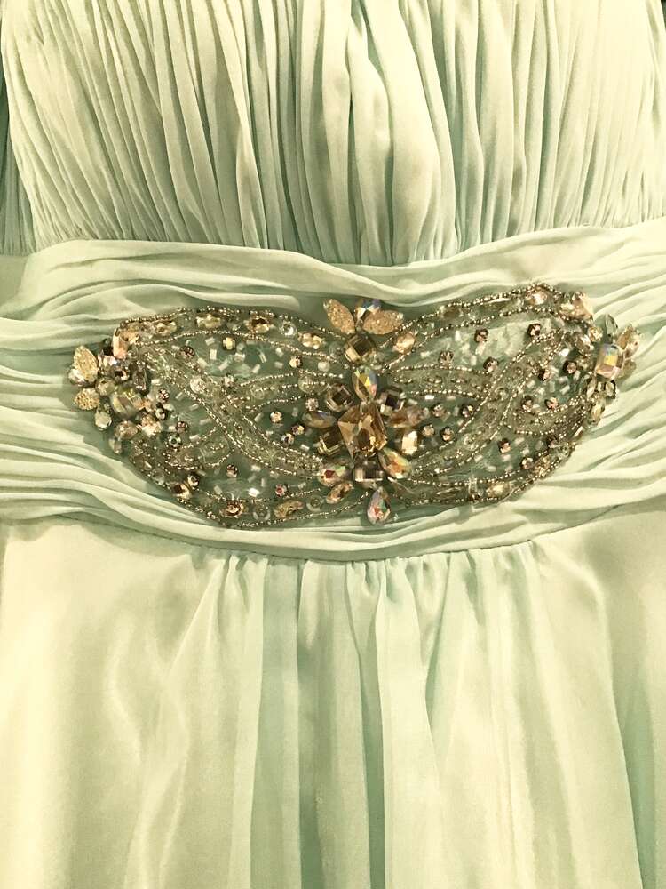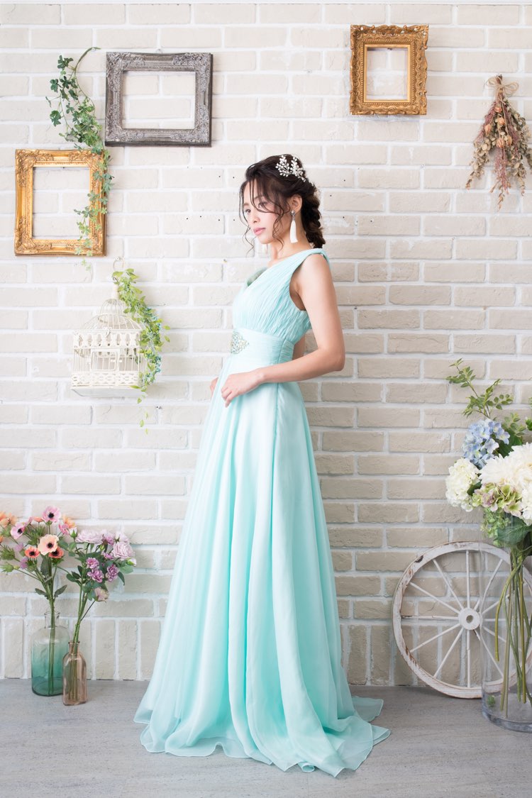 ミントグリーンウエストビジュー付ノースリーブロングドレス