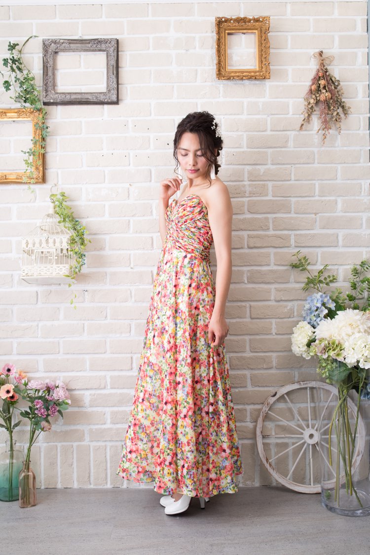 ALLURE BRIDALSはNYのブライダルドレスブランド。こちらはベージュベースにピンク・レッド系のフラワープリントベアドレス。柔らかいトーンの色味が可愛らしくフェミニンな印象。こちらのドレスはブライズメイド向けに2サイズ展開でご用意しております。羽織なしで着るのはもちろん、ホワイト・アイボリー系のボレロと合わせたコーディネートもおすすめ。また、柄物のドレスはパール形の小物とも相性抜群です。皆さんお揃いで結婚式に華を添えてみては。ブライズメイドだけでなく、女子会パーティードレスや謝恩会にもぴったり。胸元のカッティングは深めで、大人な雰囲気も感じるデザインです。