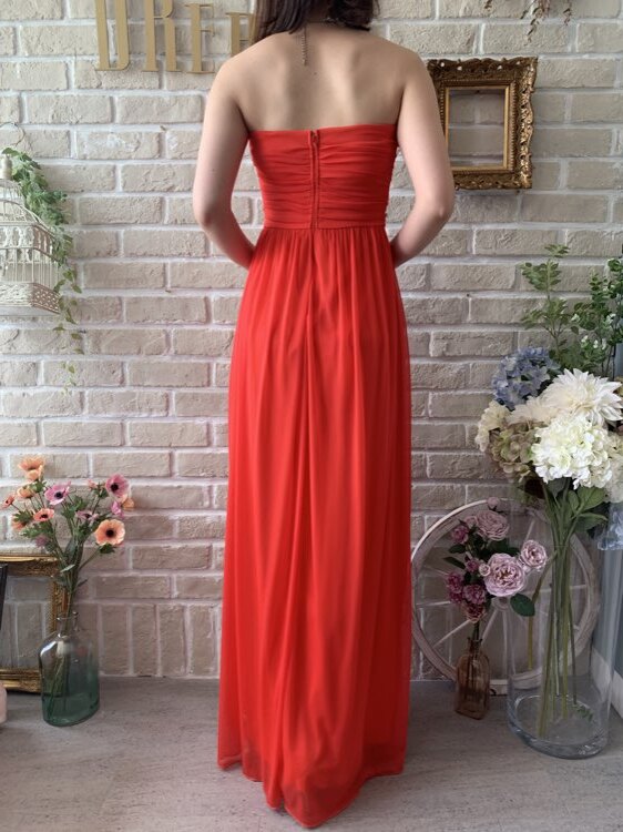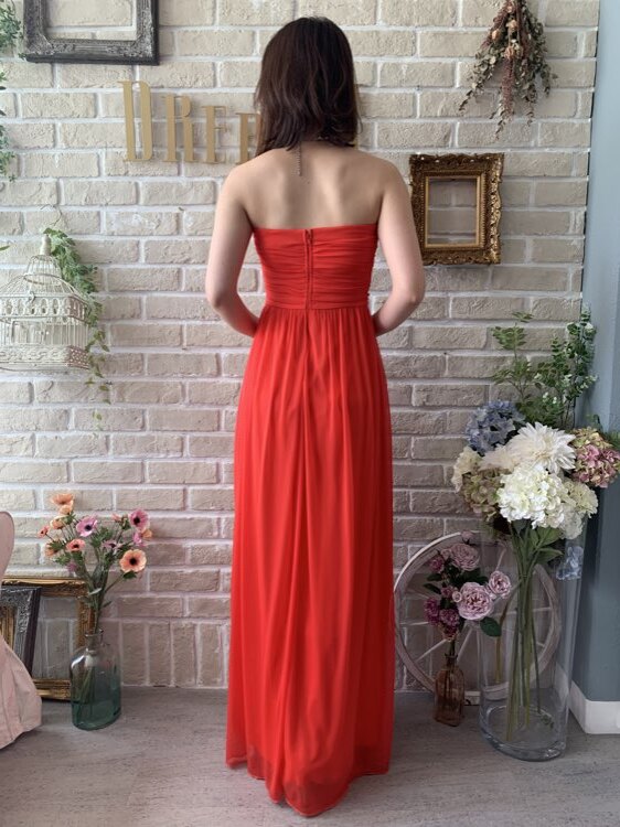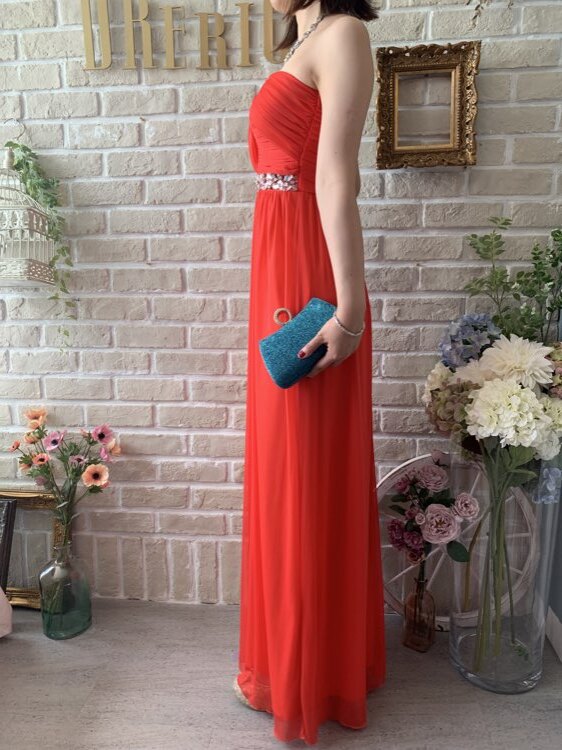 ビビッドで元気になるカラーが印象的なすっきりとしたエンパイアドレスです。カラーは朱色のようなオレンジがかったレッド。ウェストビジューが華やかでシンプルでも主役級な着こなしへと導いてくれるロングドレス。すっきりと見えるように計算されたデザインで大人かわいい女性にぴったりです。パーティーや花嫁さんの二次会パーティー、演奏会にもオススメです。胸下切り替えデザインなので脚長効果抜群です。気になるお腹周りもしっかりカバーしてくれますよ。合わせるアクセサリーでより華やかな表情をプラスできます。合わせるアクセサリーでより華やかな表情をプラスできます。